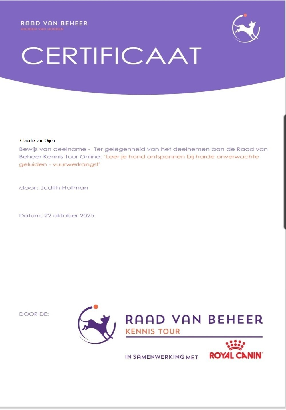 Raad van Beheer (NL) - Datum 22 oktober 2025 - Leer je hond ontspannen bij harde onverwachte geluiden - vuurwerkangst