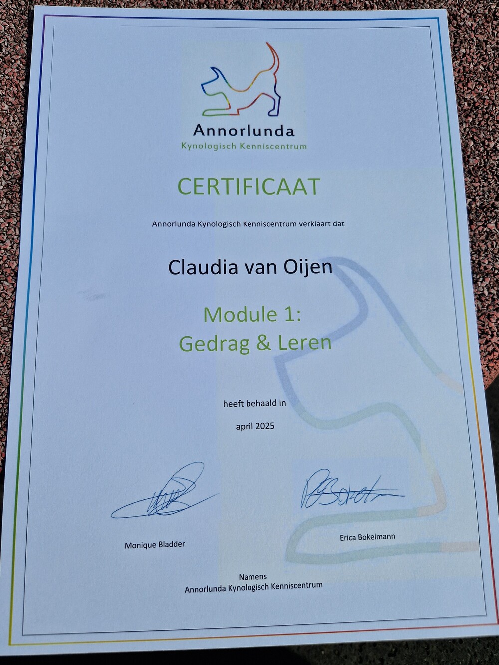 Kynologie module 1B Gedrag en leren: 4 april 2025: geslaagd met certificaat
