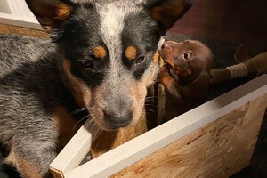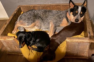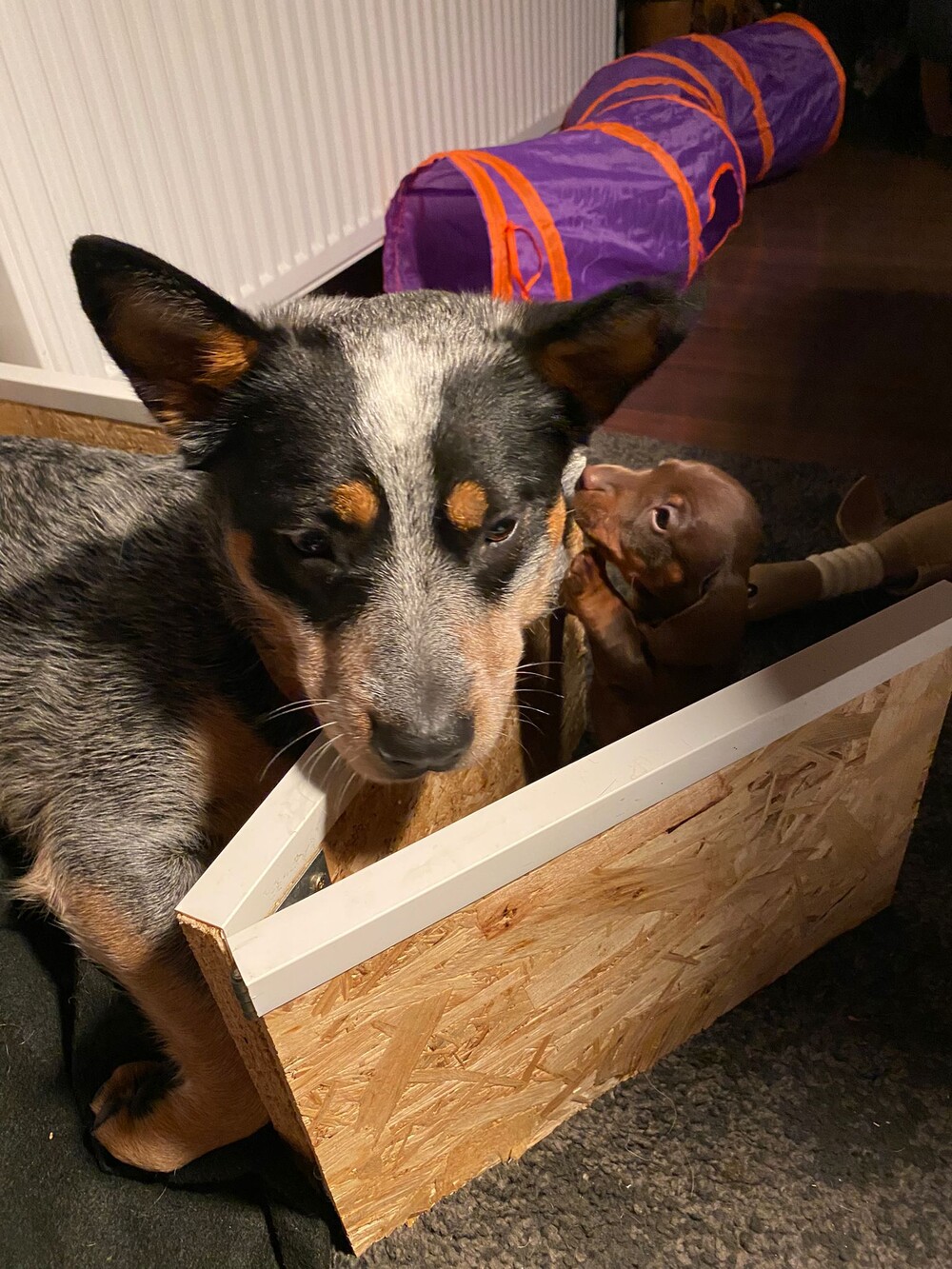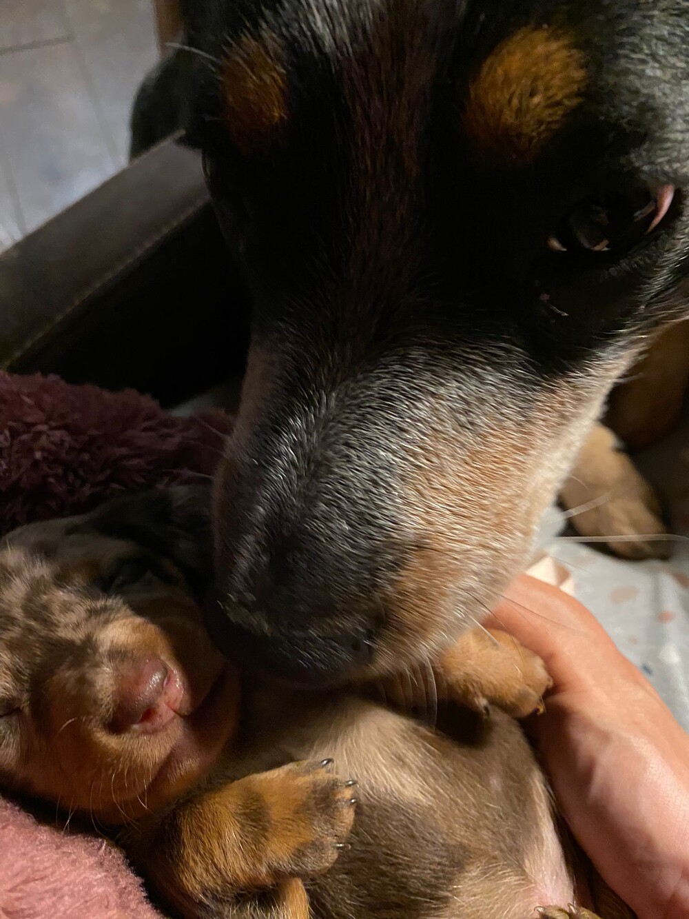 Abby Lavie verzorgt de nest ook: Fiep ontlasten, Fiep gaat dan naar buiten, terwijl binnen alles schoon wordt gemaakt en Abby Lavie mag even op de pups letten, gezellige familie.