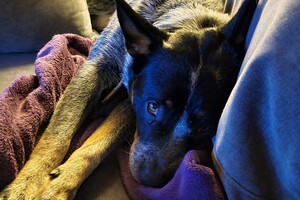 Ik was effe....waar is kleed?! - die ligt buiten - bedankt hondjes. Het blijft opletten met ze.