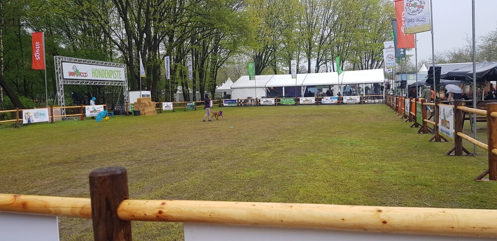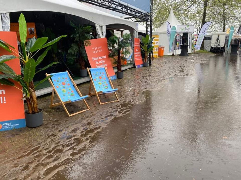 Zover gingen we schuilen bij een bedrijfsstandje en kregen de honden wat lekkers