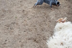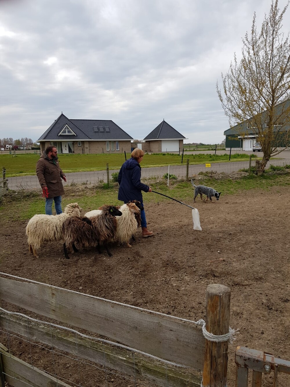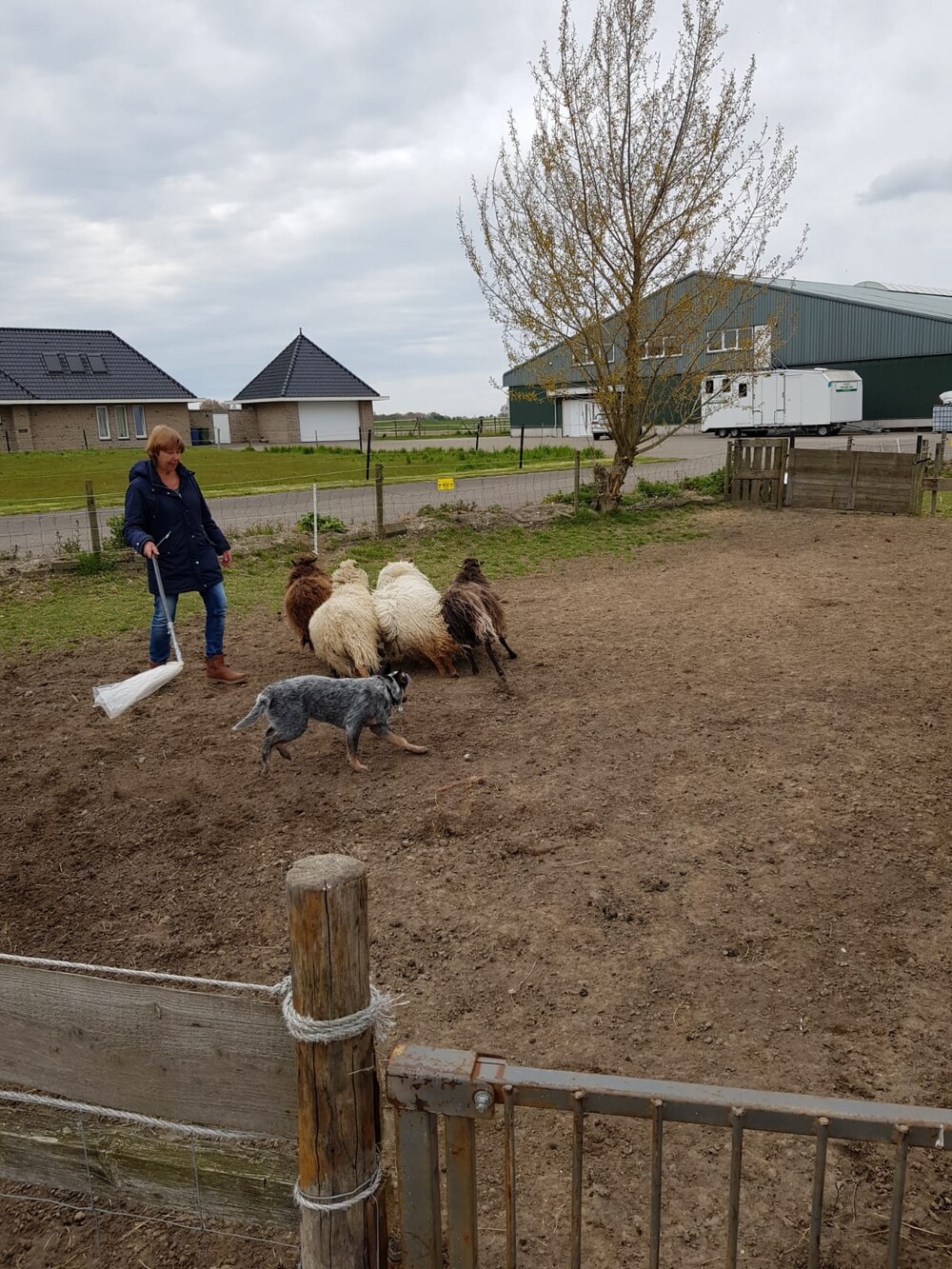 6 mei: Yvon eerste les als handler: moet ik nou op Ava Kira letten of op de schapen: het valt niet mee, maar het is erg leuk. Het ging prima, zeker toen Kira plannen had om bij een schaap in de kont te bijten. Yvon greep goed in!