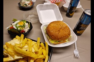 Vlug eten en weer vlug gaan: honden in de auto, honden uit de auto, tussendoor: hond ophalen van dagopvang en weer door naar trainings sessie, honden in de auto...