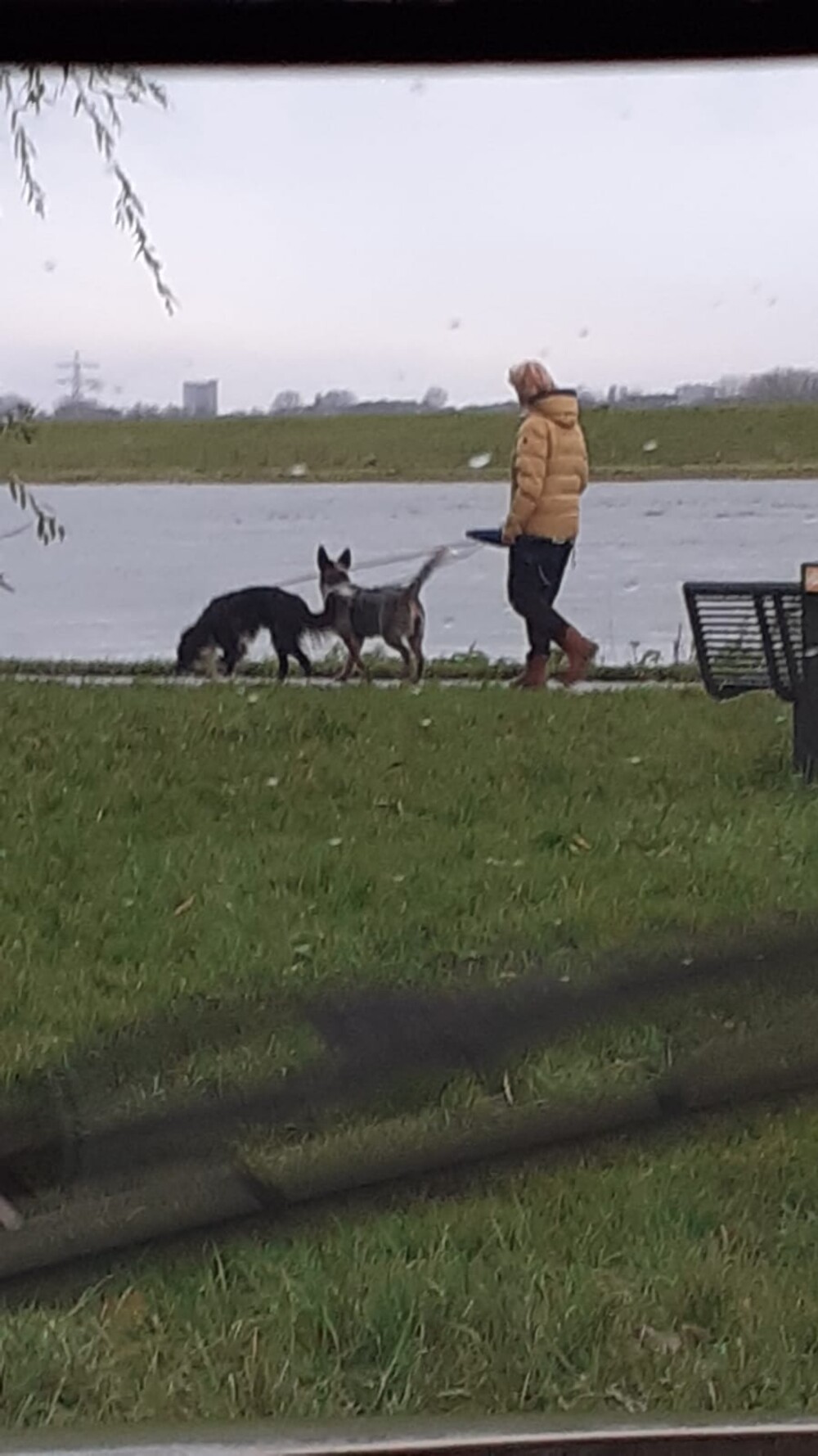 Rinus, wacht wel even. Yvonne is met de honden wandelen: het waait erg hard.