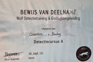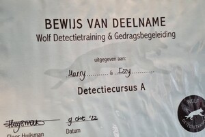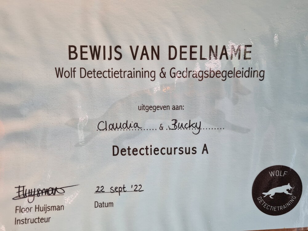 We hebben detectie A met de honden afgerond en certificaat daarvan.
