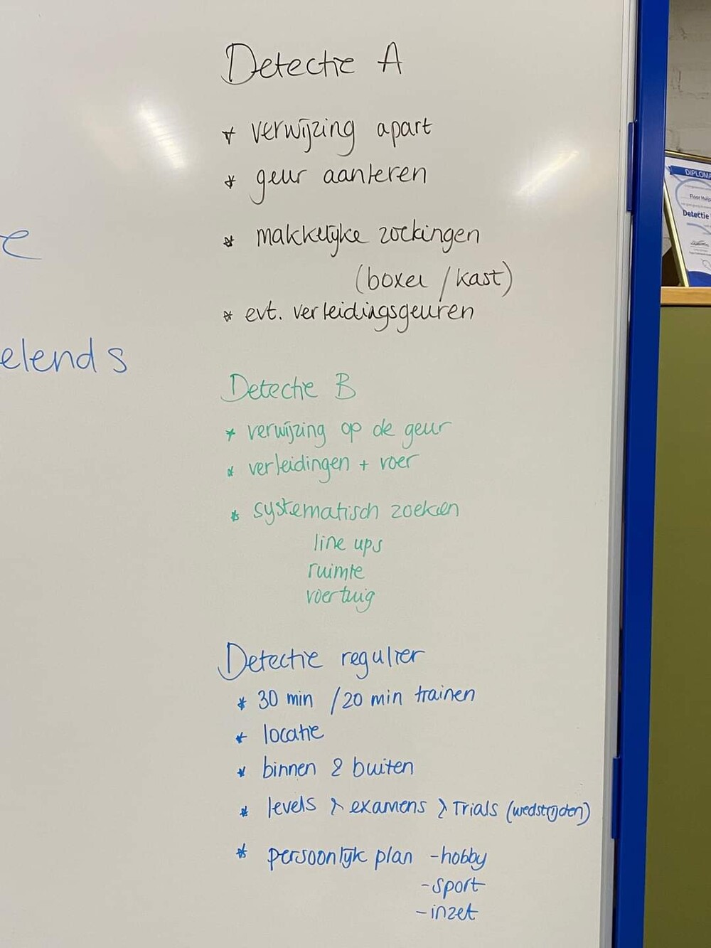 Globaal idee van de cursus A, B en de reguliere lessen detectie. Natuurlijk kan het zijn dat de ene combinatie het net wat sneller oppikt dan de andere, maar over het algemeen is dit hoe de cursussen zijn opgebouwd. (Zie foto)