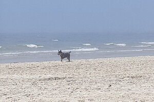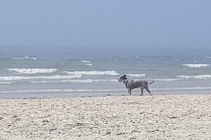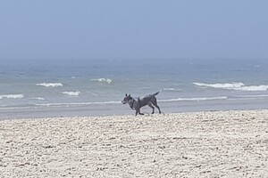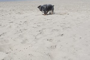Vanmiddag ging het prima en wordt elke dag leuker. Ik heb vanmiddag fluit geprobeerd, op het strand, dus nog nooit eerder fluit geprobeerd: Ava Kira, staat aan zee, ik zeker 50 meter verder en ik fluit, Ava Kira komt op me af, vlak voor mijn neus zit en lie down, PERFECT!