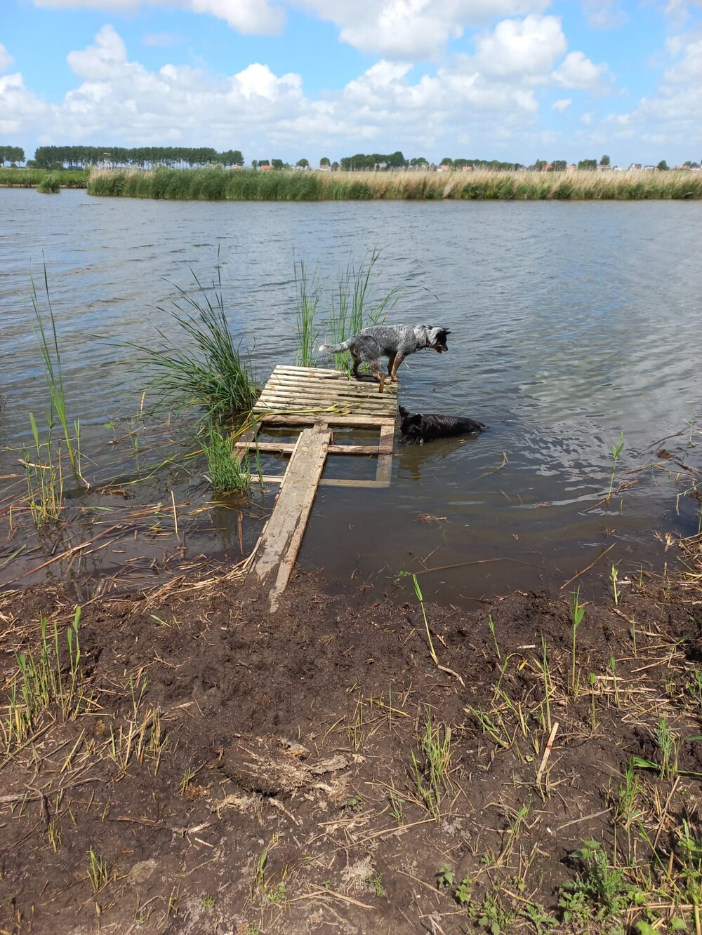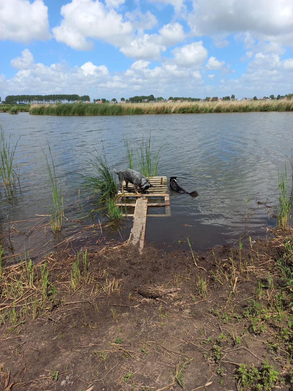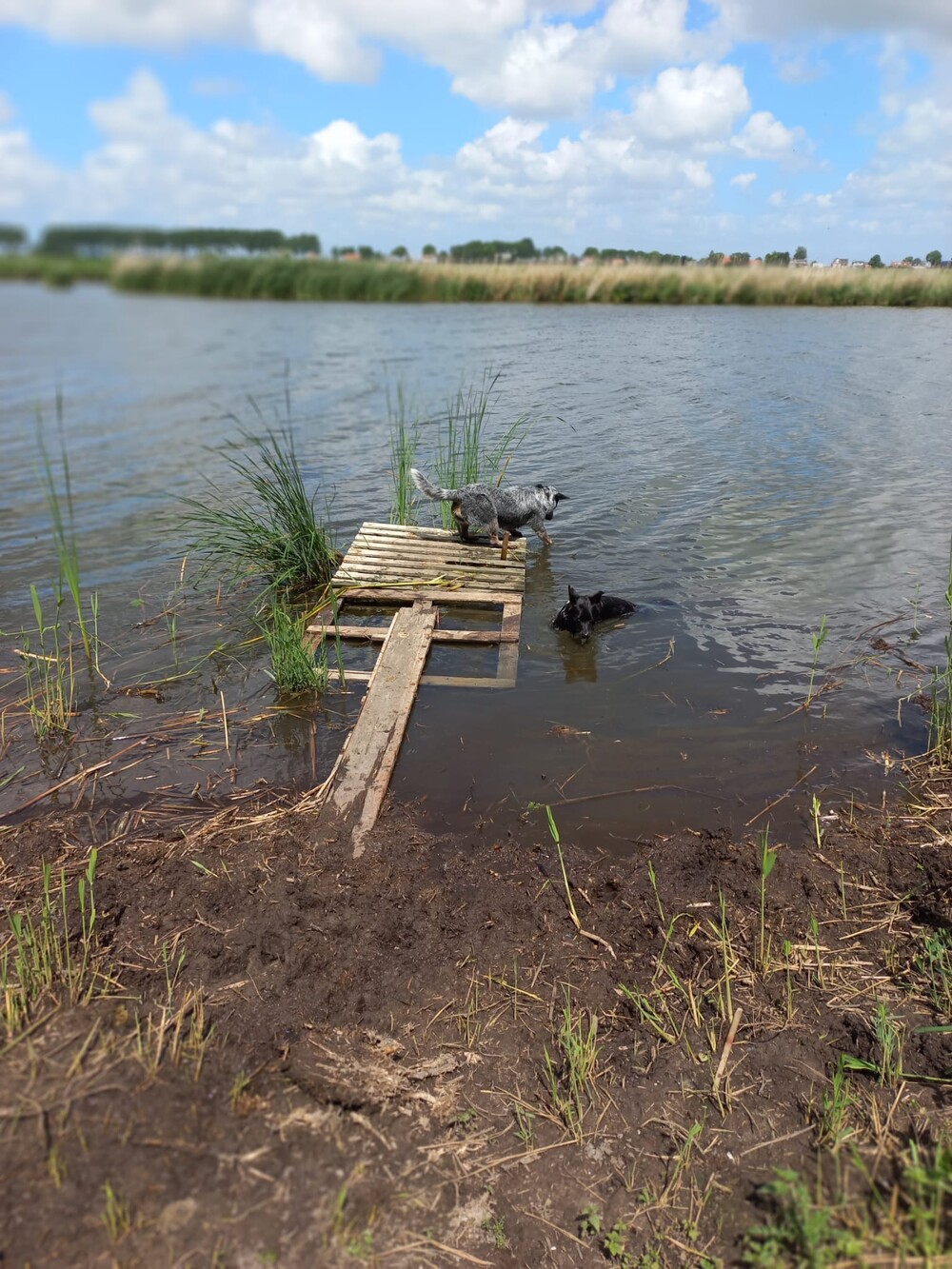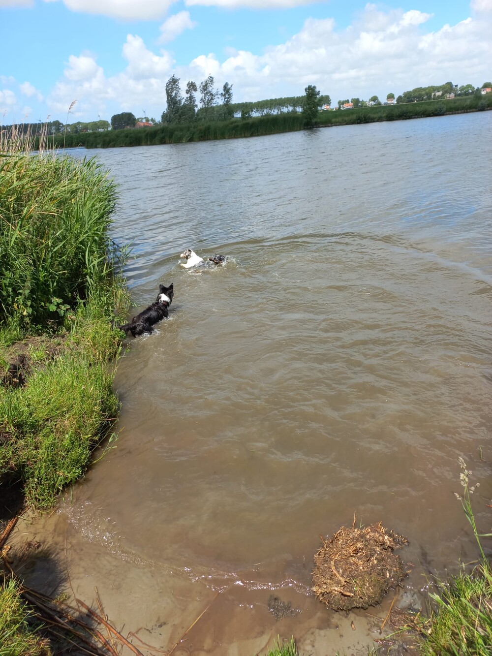 Lekker spelen in het water, opeens kwam er een Shepherd erbij: spelen met zijn drieën