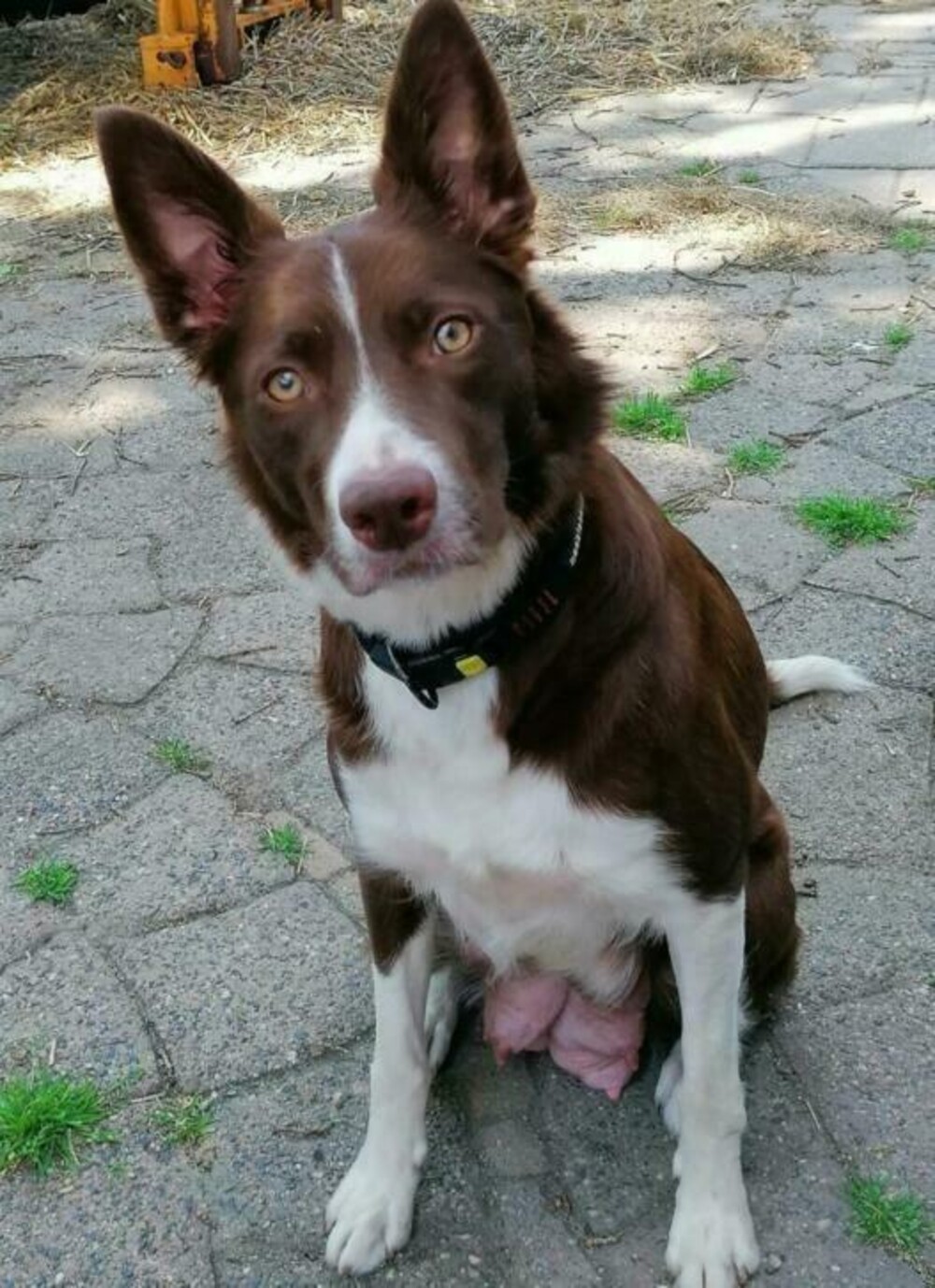 Flynn is zwart met beetje wit, borst met witte pootjes, in zijn nek en klein beetje wit op voorhoofd.