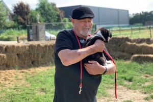 Flynn is zwart met beetje wit, borst met witte pootjes, in zijn nek en klein beetje wit op voorhoofd.