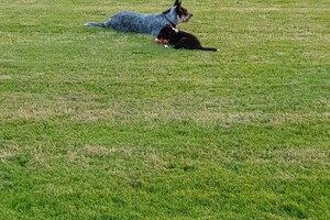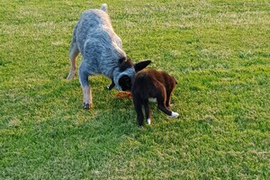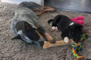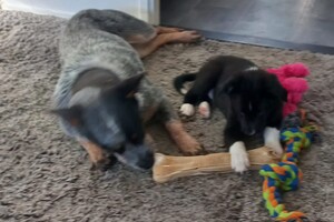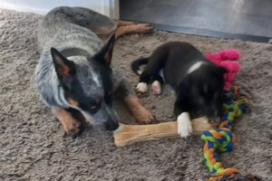 Australische cattle dog is trouw, deelt alles met zijn beste vriend en wat Ava Kira en Flynn nodig hebben: lieve familie, eten, aandacht en liefde en dat geven de honden dubbel terug. Het is nu al dolle pret in huis.