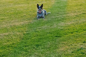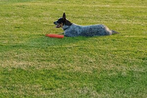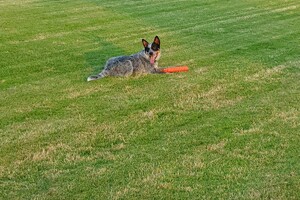 19 juli: lie down trainen, al een poosje is Ava Kira zonder lijn, dus dat is vrij spelen met Flynn