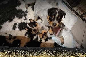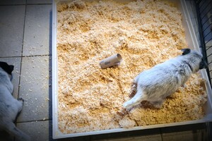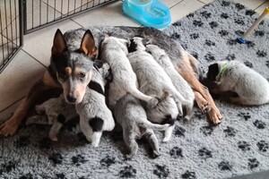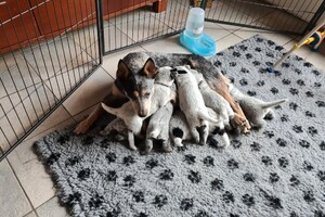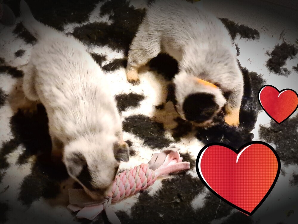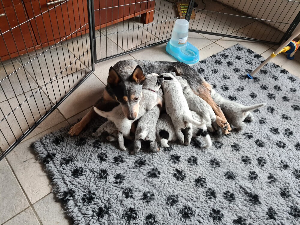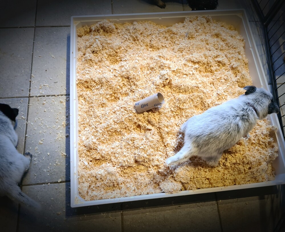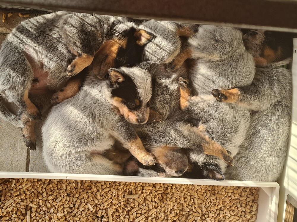 Hun karakter komt elke dag steeds meer naar voren, dus dat is mooi om te zien en om waar te nemen. Zover geeft het hier wel rust: moederhond doet goed mee met moedermelk geven en dat wordt nu minder, want de puppy's krijgen tandjes en dat is op dit moment goed aan het doorkomen. Verder heb ik wekenlang langs de werpkist geslapen, moederhond meegeholpen met de puppy's, zodat de hond rustig kon liggen en routine is toch anders, dus ze moest er ook regelmatig in de nacht eruit. Verder heb ik de hond meegeholpen door puppymelk te geven aan de puppy's en nu krijgen ze toch al volwaardige voeding in een prak vorm, verder zijn de puppy's nu speels en ontdekkend, dus ik heb elke keer wel een nieuw speeltje voor ze, of ik kom weer langs met de poetsdoek en de stofzuiger, dat vinden ze minder maar de reactie daarop is ook wisselend, soms durft de puppy het toch wel even op te nemen tegen de stofzuiger...als ze spelen met ekaar, dan zijn ze uitdagend tegen elkaar, ze kunnen ook goed klimmen als ze willen.