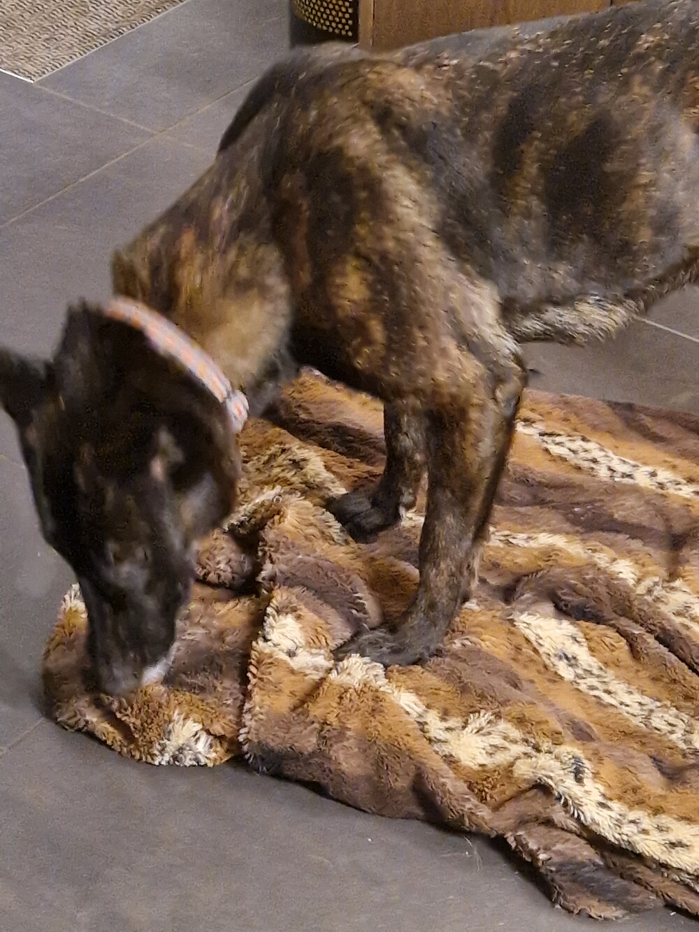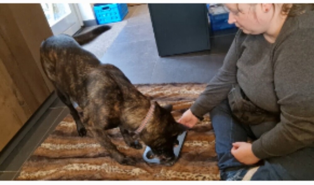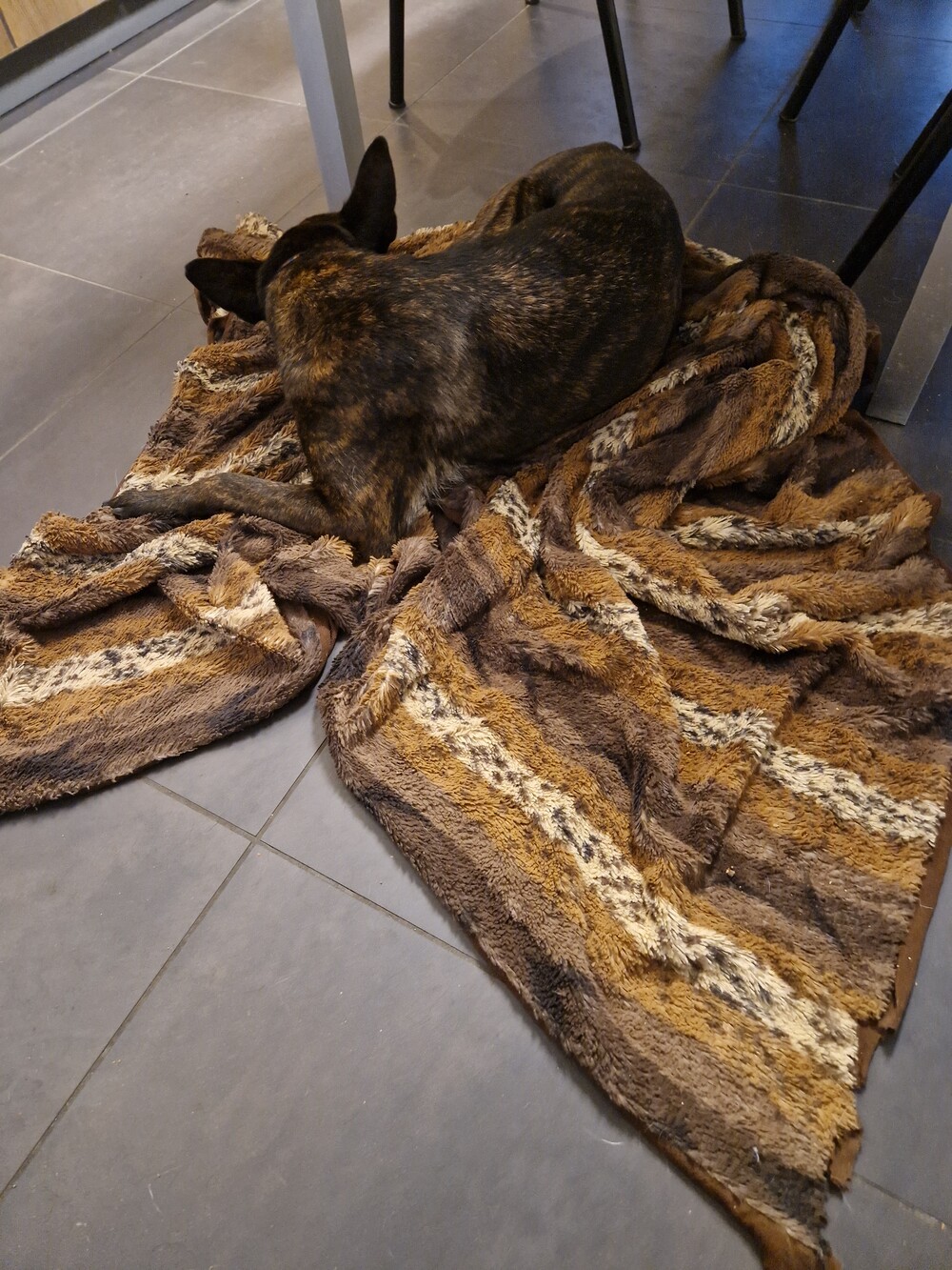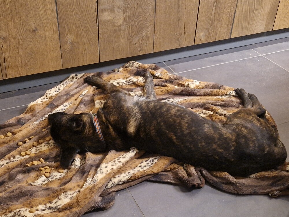Bucky is voldaan, brokjes liggen erbij (na het hersenwerk nog gegeven)