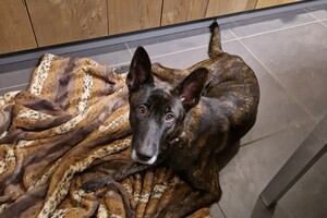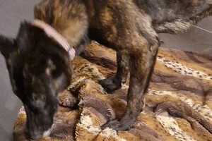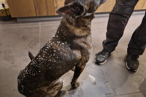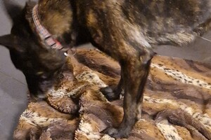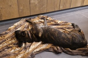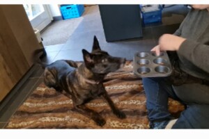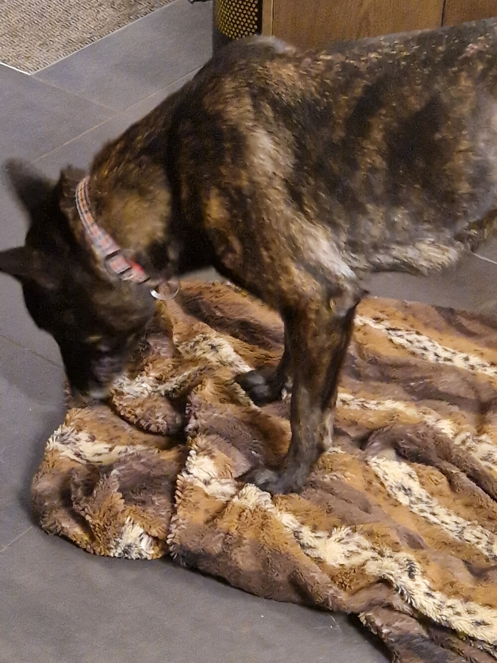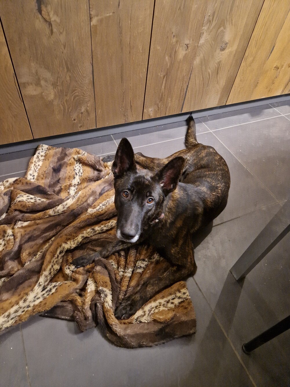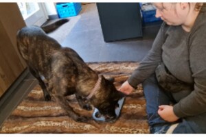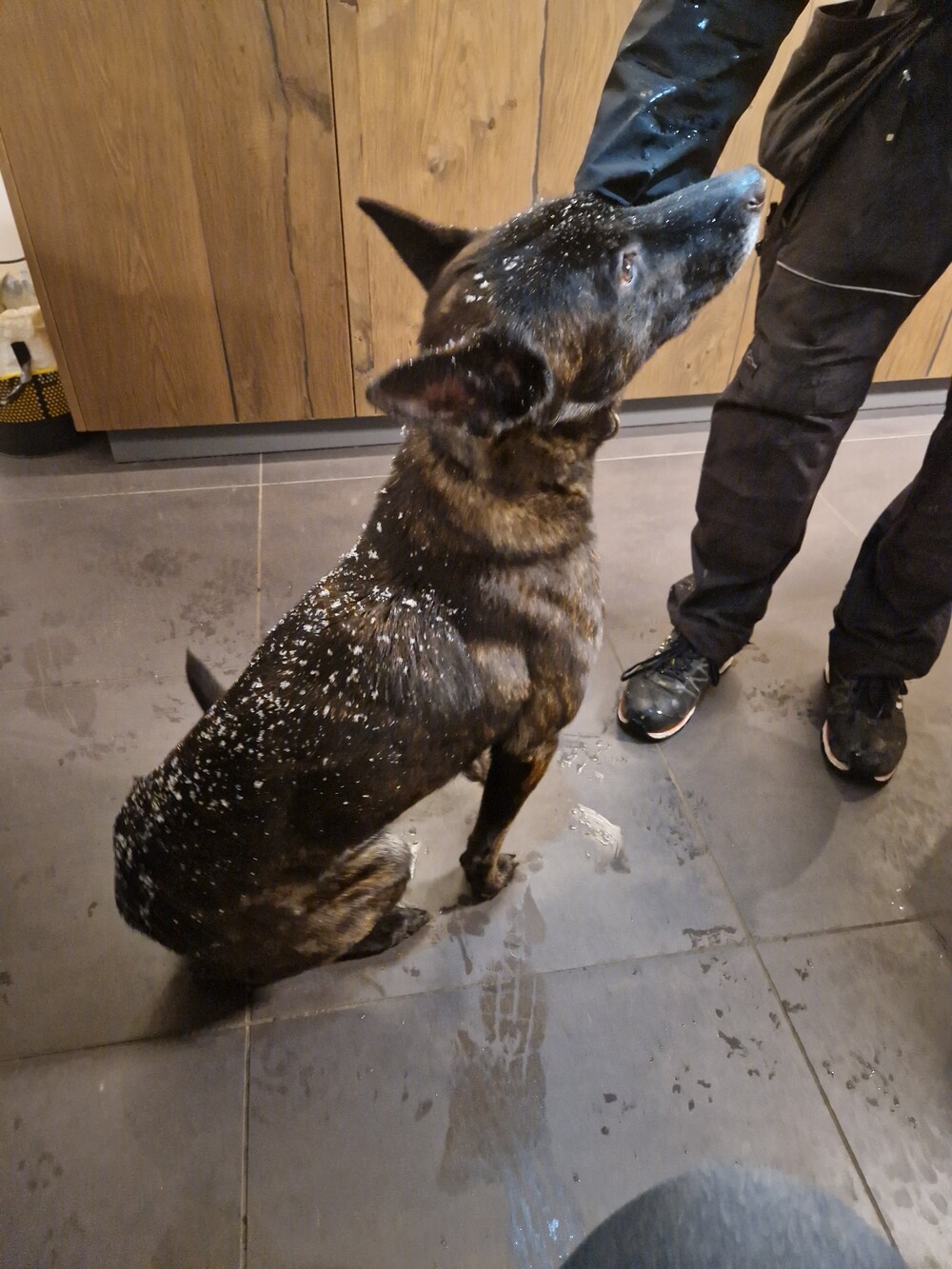 Bucky is voldaan, brokjes liggen erbij (na het hersenwerk nog gegeven)