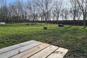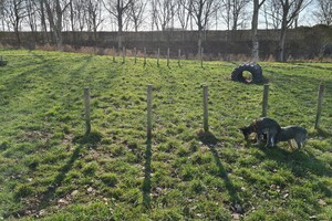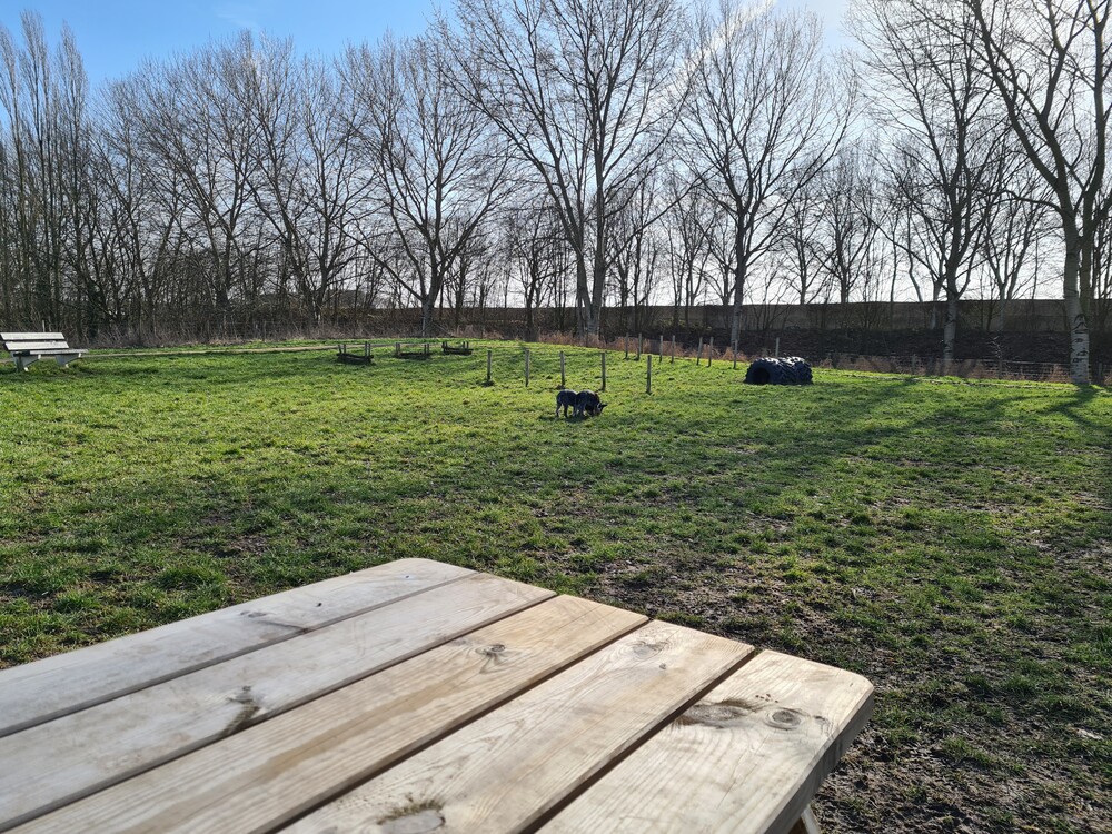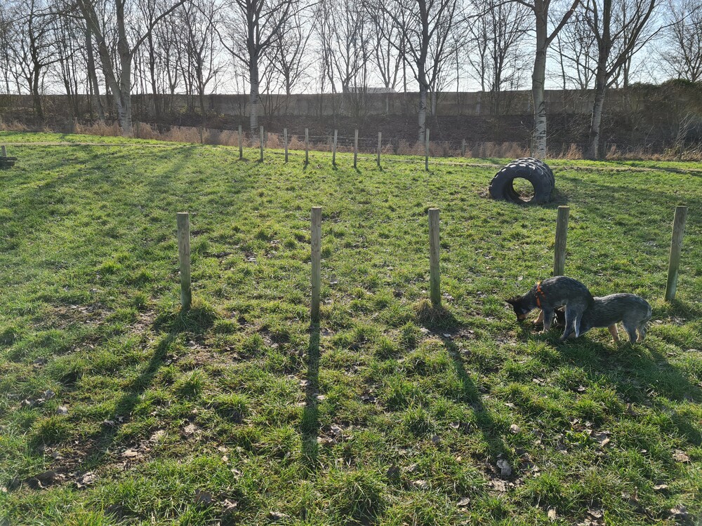 Leuk speelveld voor de honden, met aligity training en buis om doorheen te lopen.