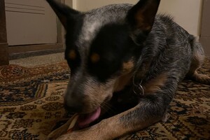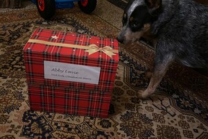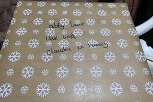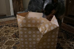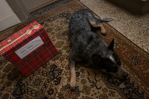 Kerstpakket van Claudia en Harry. Zelfs Frits is aan het kauwen.