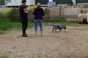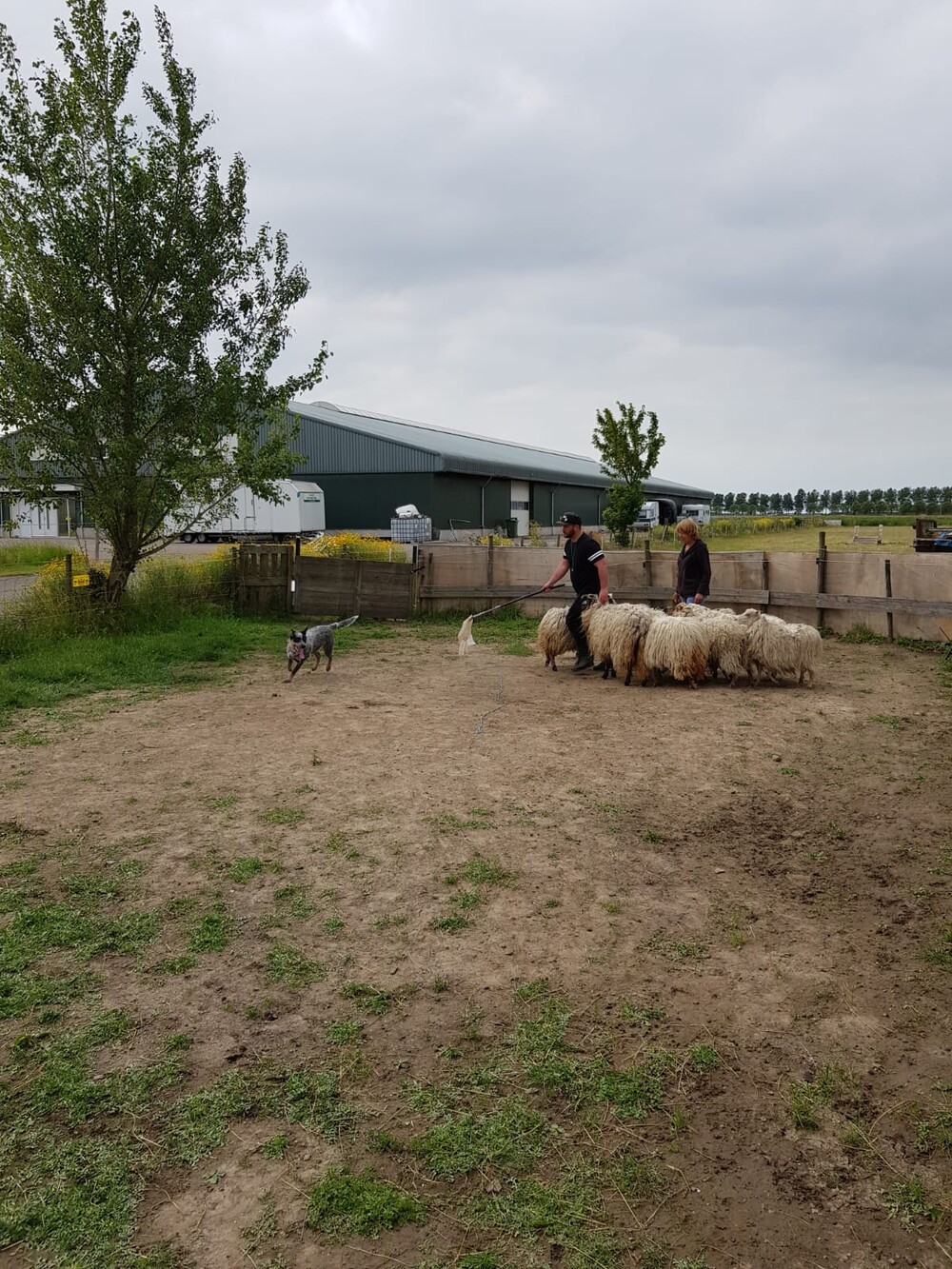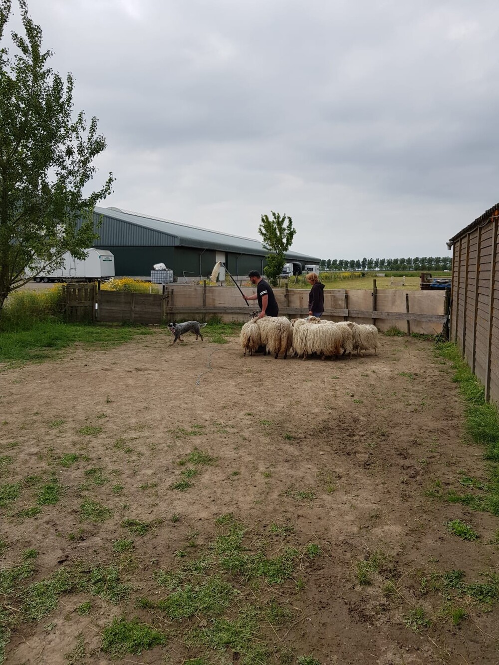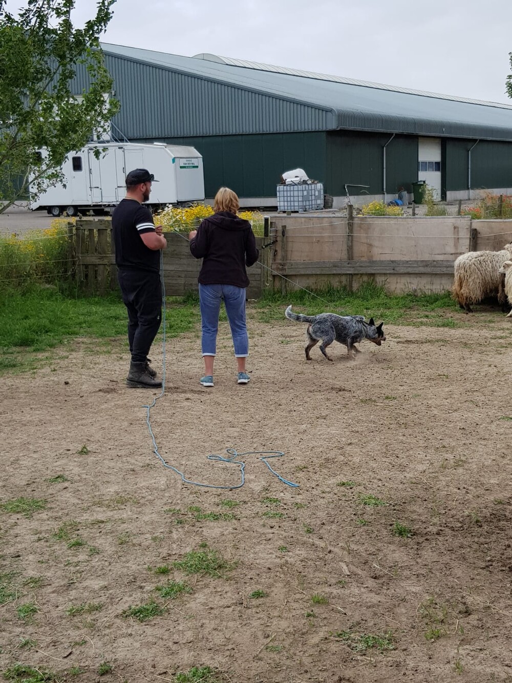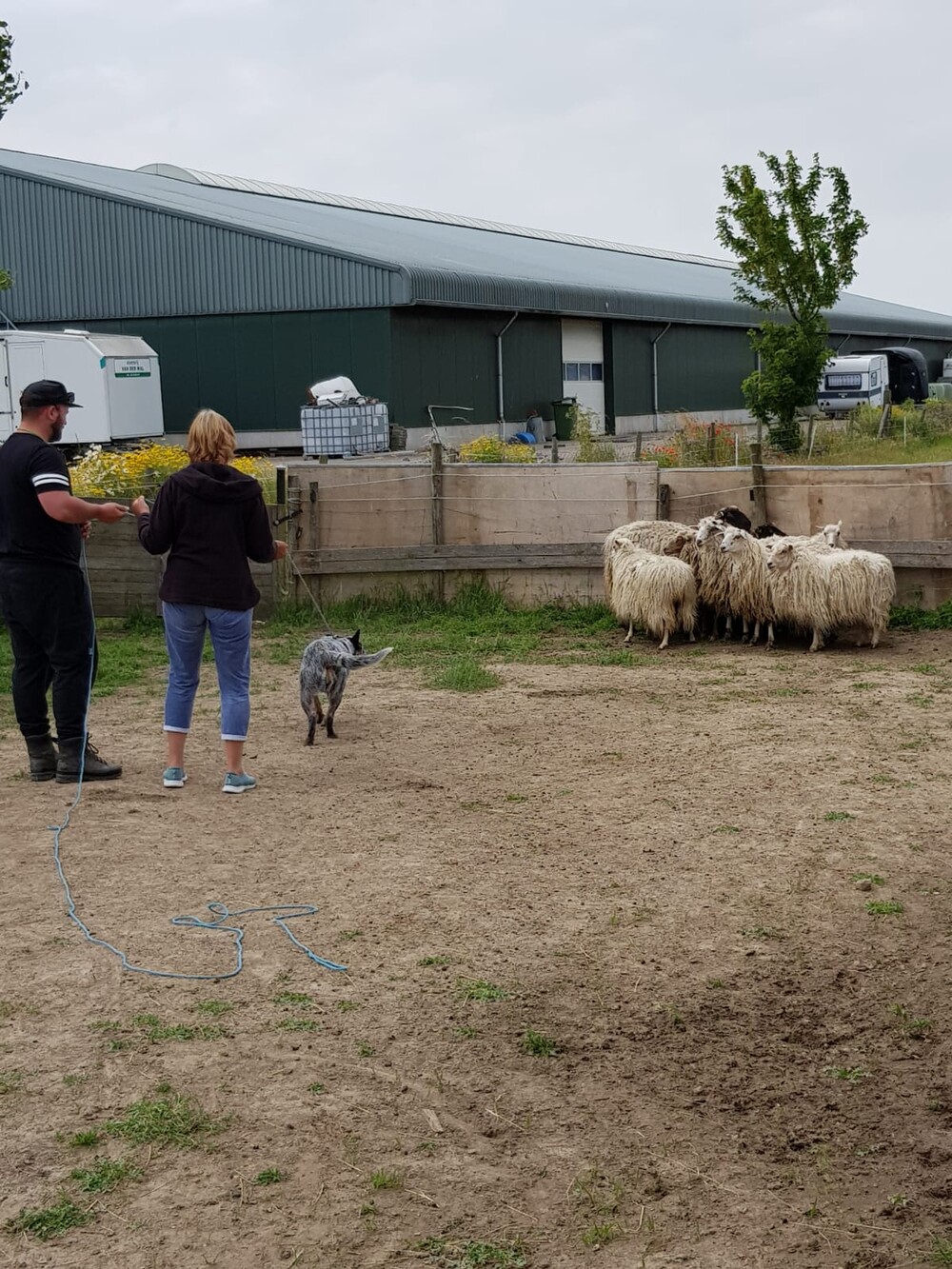 23 juni: Les 6, Ruim om de kudde lopen, lie down wanneer het gevraagd werd, leren om niet te bijten. Handler was zeer tevreden, ze wordt nu wel behoorlijk sterk