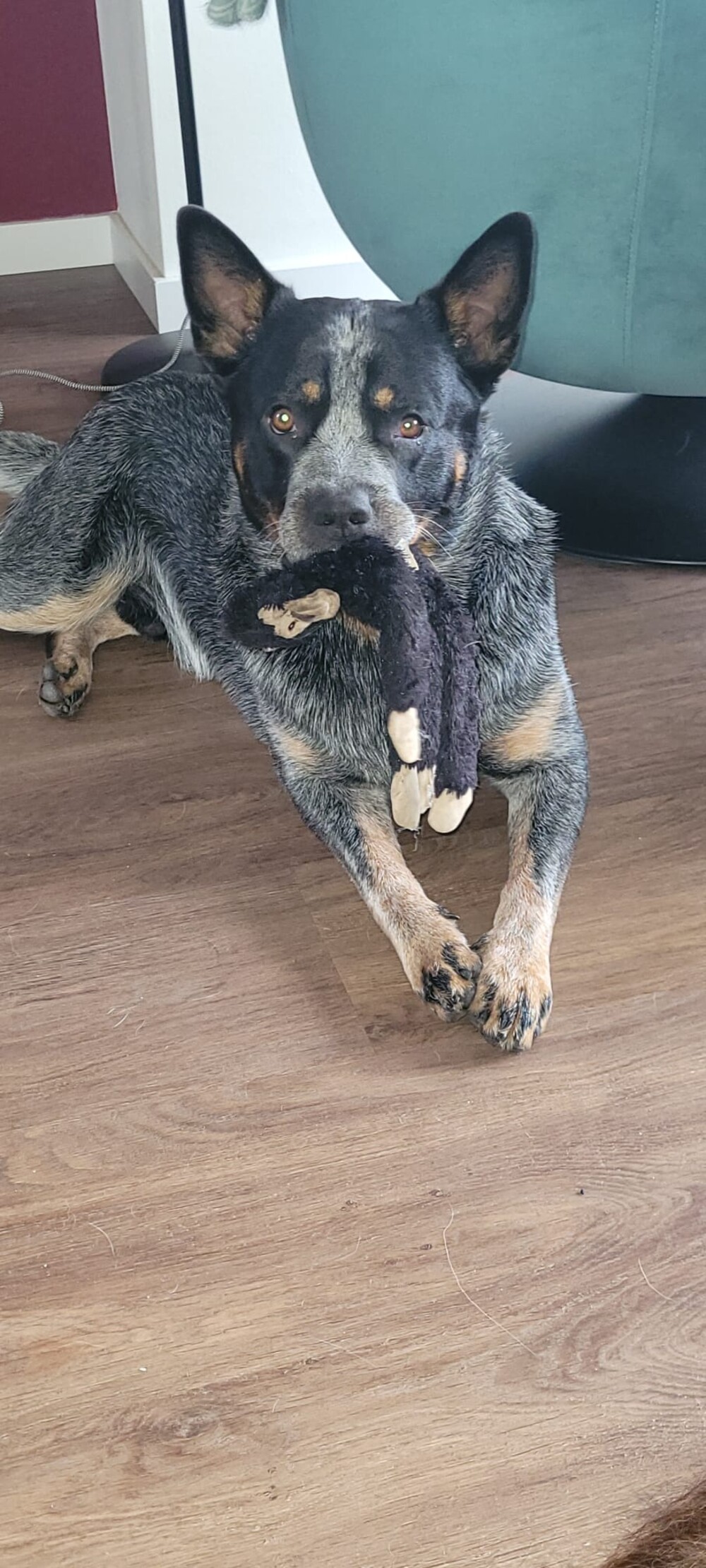Aapje heeft in het nest gelegen: de eigenaars kwamen kijken en hebben deze aapje voor het hondje meegenomen, sindsdien heeft Ezran Dundee zijn aapje bewaard. Erg schattig.