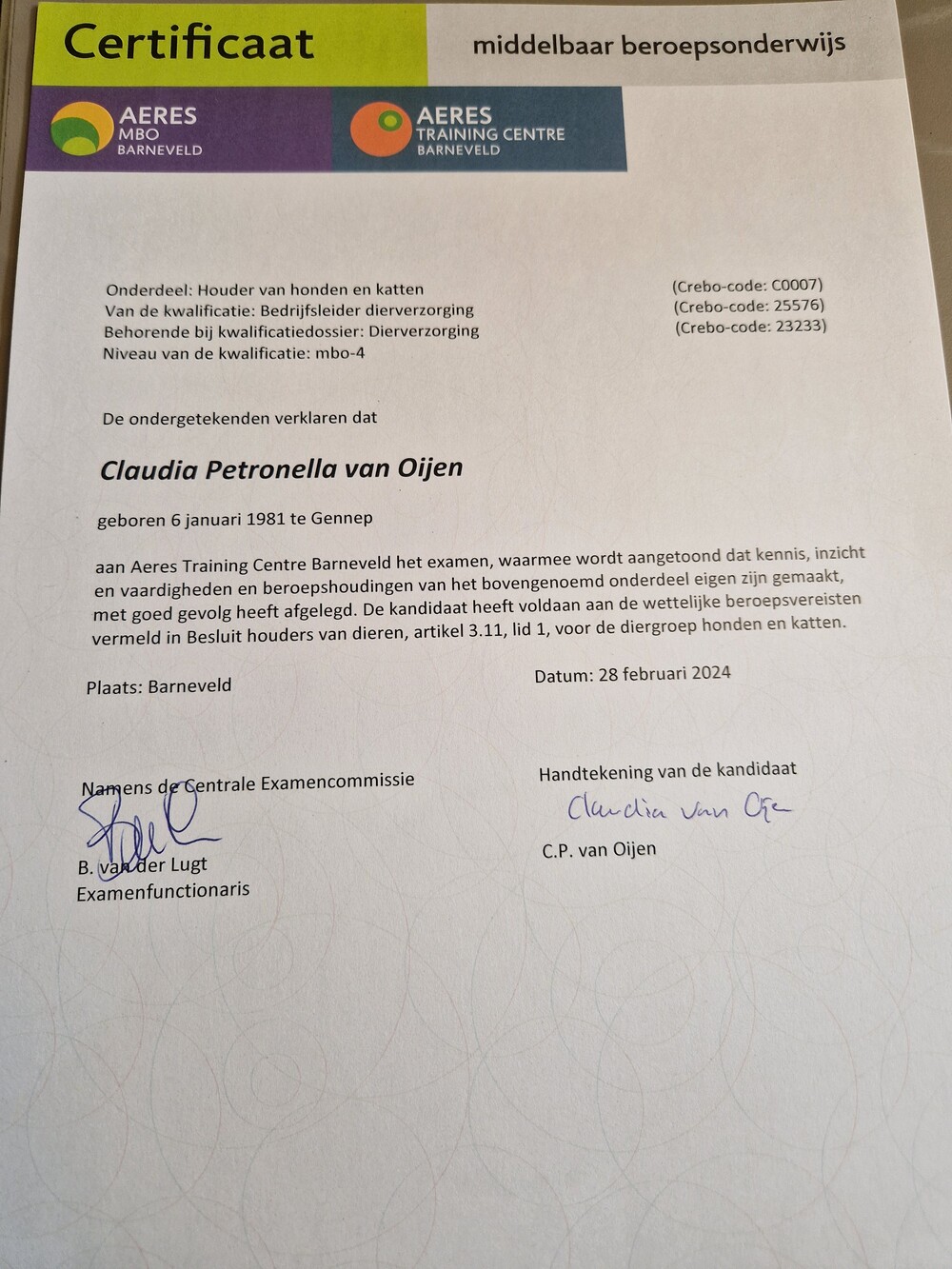 Certificaat Ondernemer asiel, pension, cattery en kennel