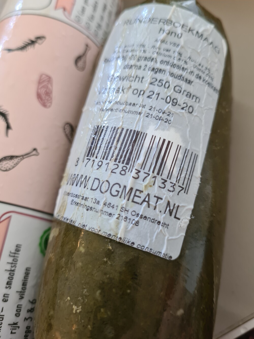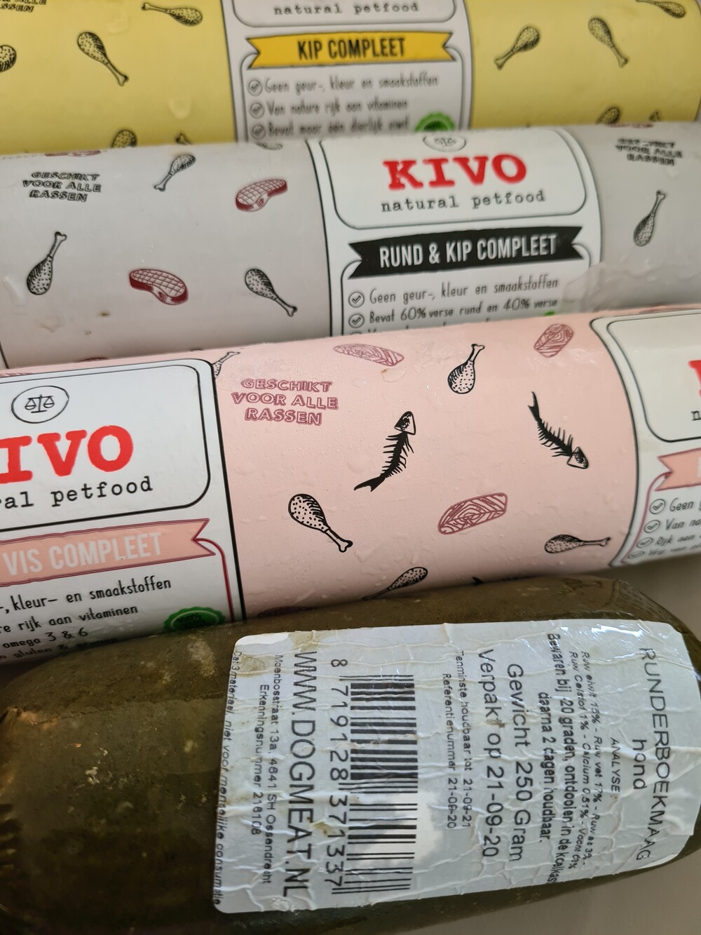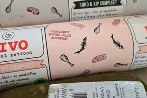 Vers vlees van Kivo, Dogmeat, Degomeat (500 gram) met soms toevoeging rijst, aardappelen, macaroni, gemalen groenten.