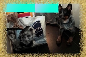 Ik heb twee mooie tassen ingepakt voor onze Izzy: bijvoorbeeld: brokjes die ze gewend is om te eten, 10 Kivo worsten, 1 boekmaag, een wandellijn, een halsband, nog aardig wat snacks voor de hond: snoepjes, kauwstaafjes, trainers etc., haar etensbak...kortom alles bij elkaar een mooi pakket.
