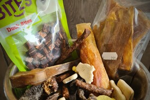 Tussendoortjes: pensstaaf, kauwkluiven etc. komkommer, banaan, blauwe bessen, appel, peer, ei, soms rauw, soms gekookt.