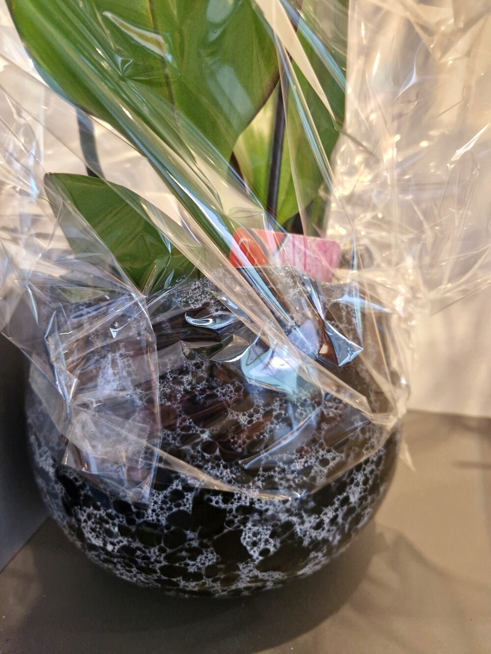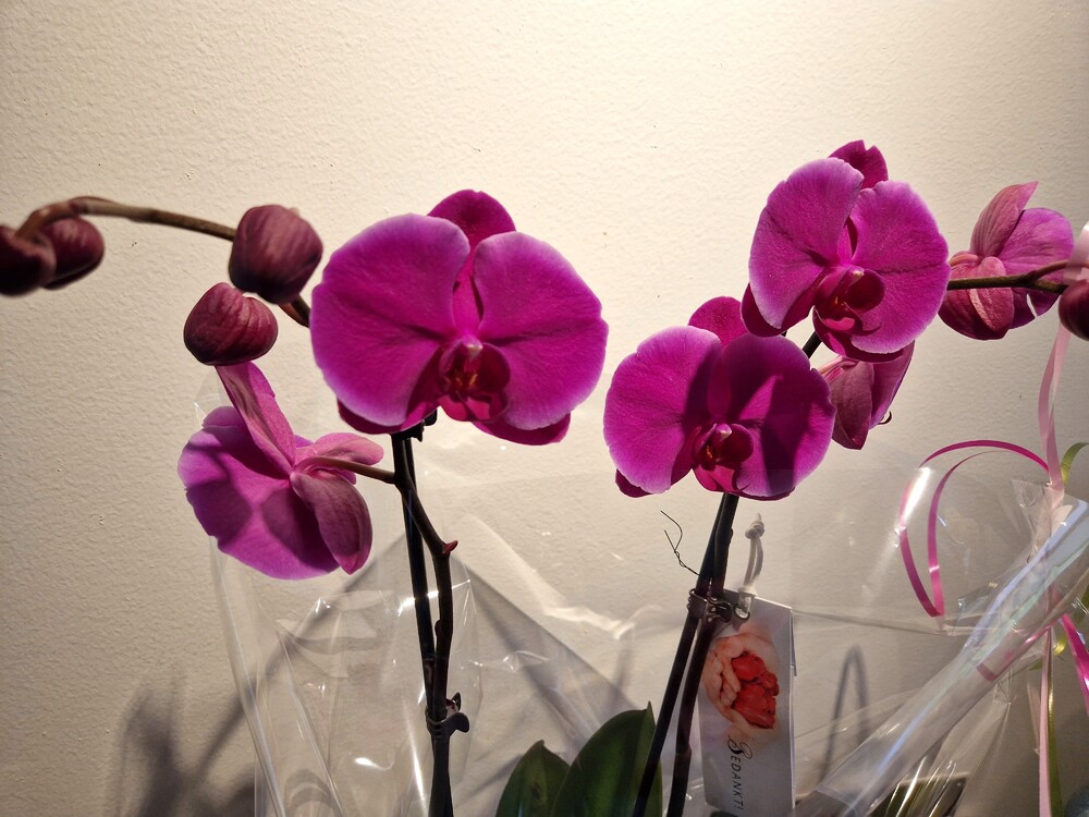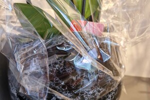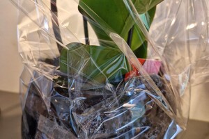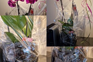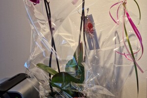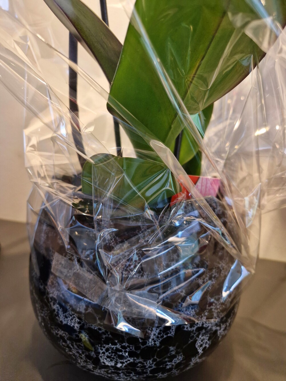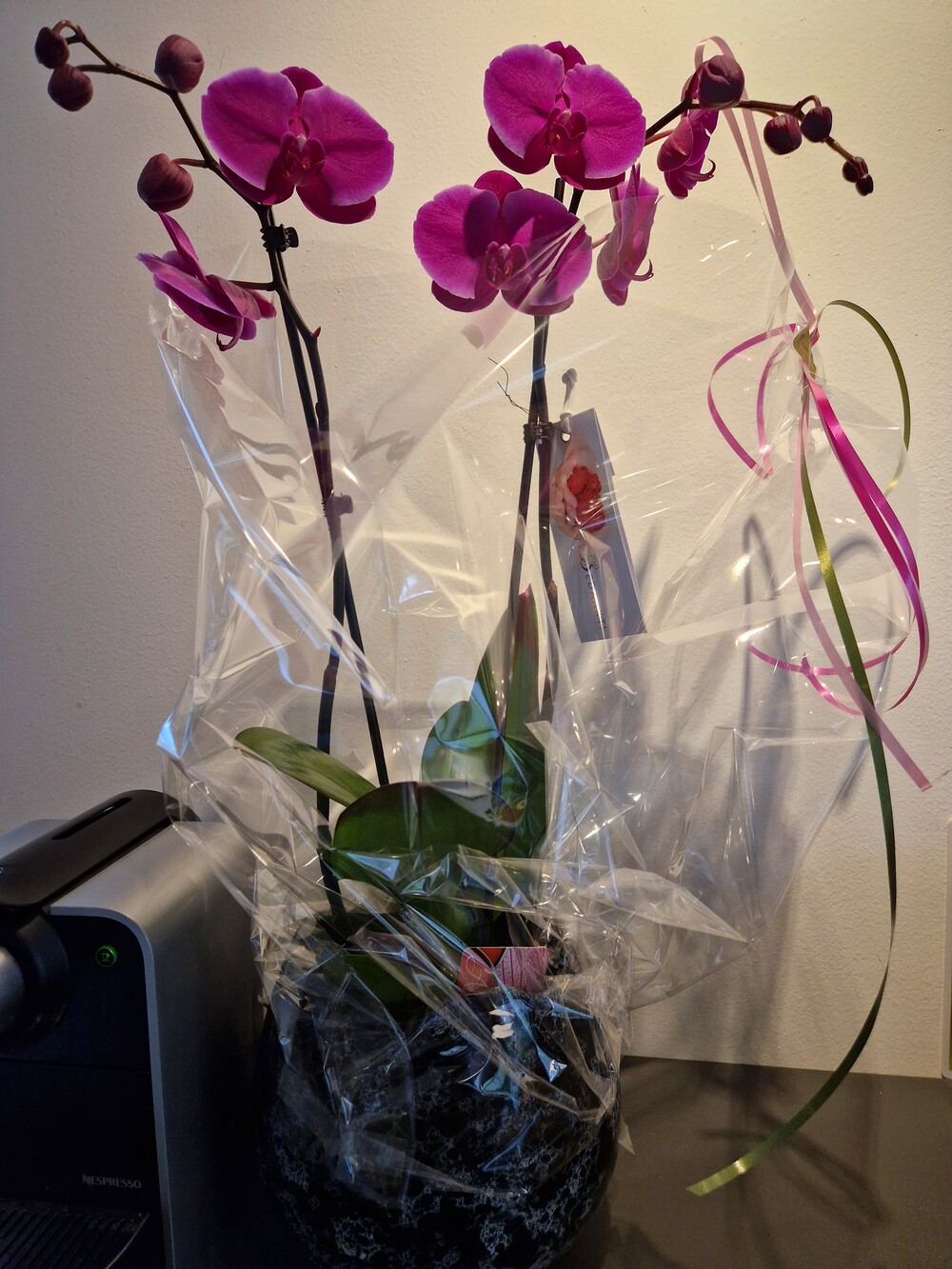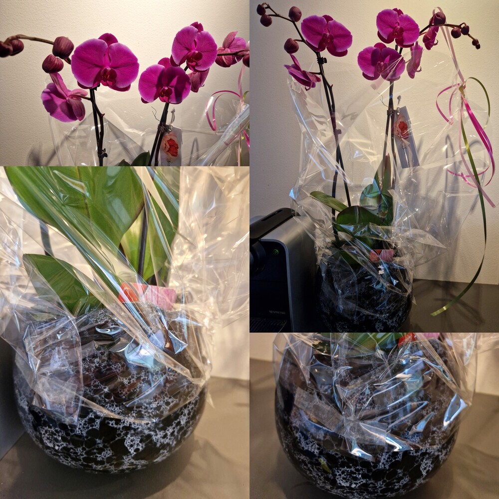 We hebben de instructeur bedankt en twee zakjes van Bellobox gegeven: twee verschillende smaken snoepjes voor de honden en we hebben een orchidee gekocht met een bloempot uitgezocht voor haar.