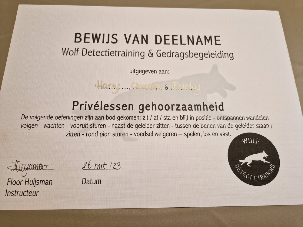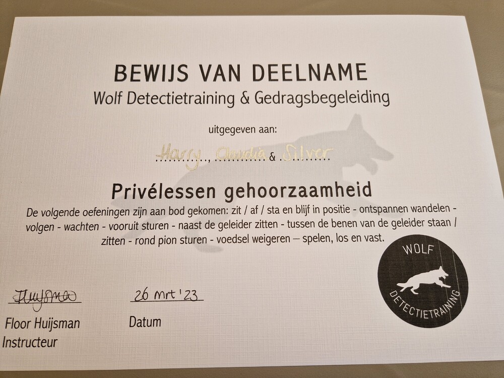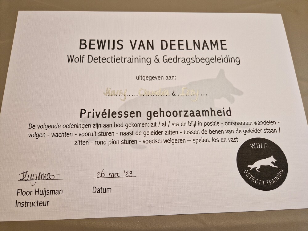 Detectie les en gehoorzaamheid certificaten gekregen bij de laatste les