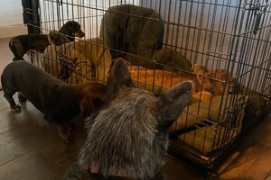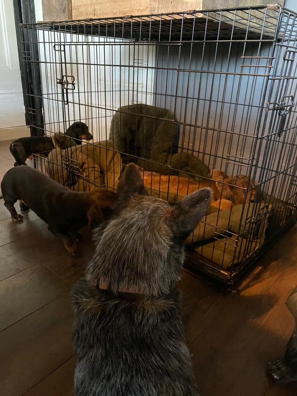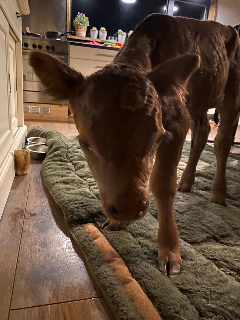 Dexter kalfje, gisteravond opgehaald: heeft het koud, mag in de keuken en in de bench