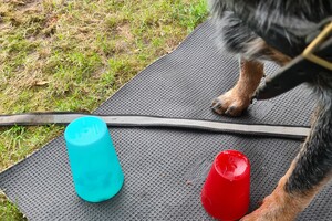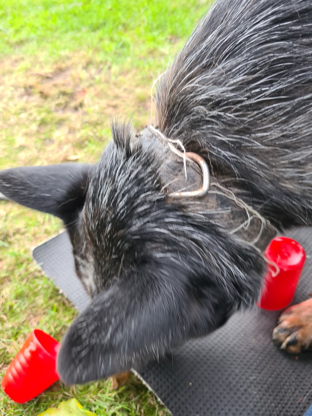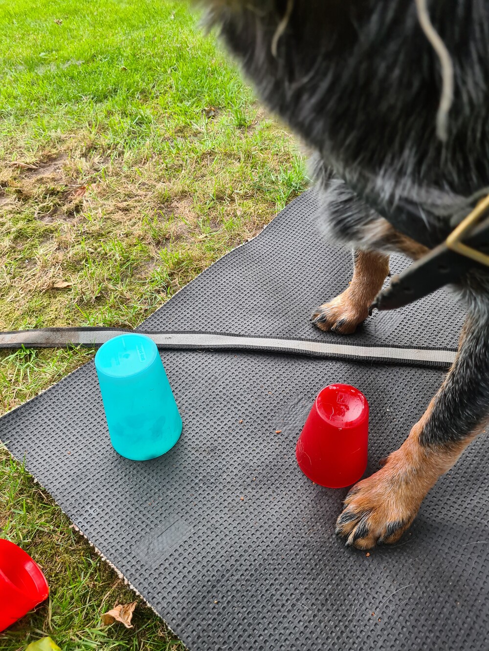 26 juli: Yada krijgt hersenwerk workshop, 6 lessen en er zijn andere cursisten met hun hond, er is genoeg afstand van elkaar. Yada doet het erg goed, maar vindt het wel spannend. Ze doet de spellen goed mee: de gemakkelijke spellen doet ze zo, dus volgende keer iets moeilijker: stapsgewijs opbouwen.