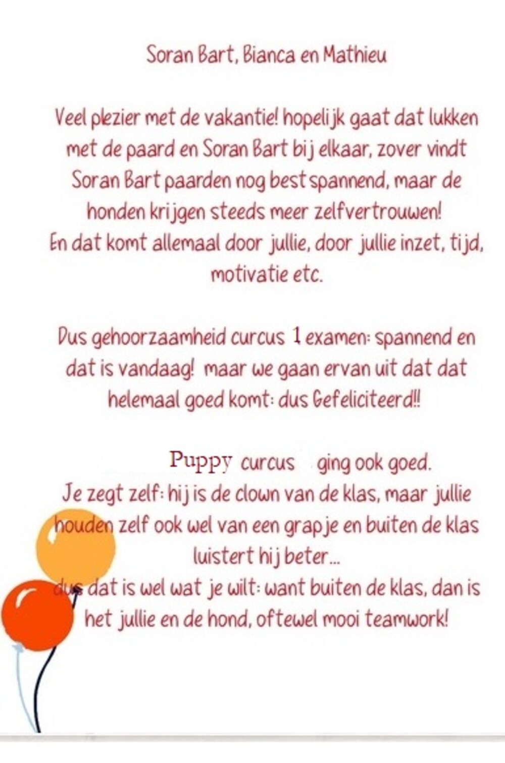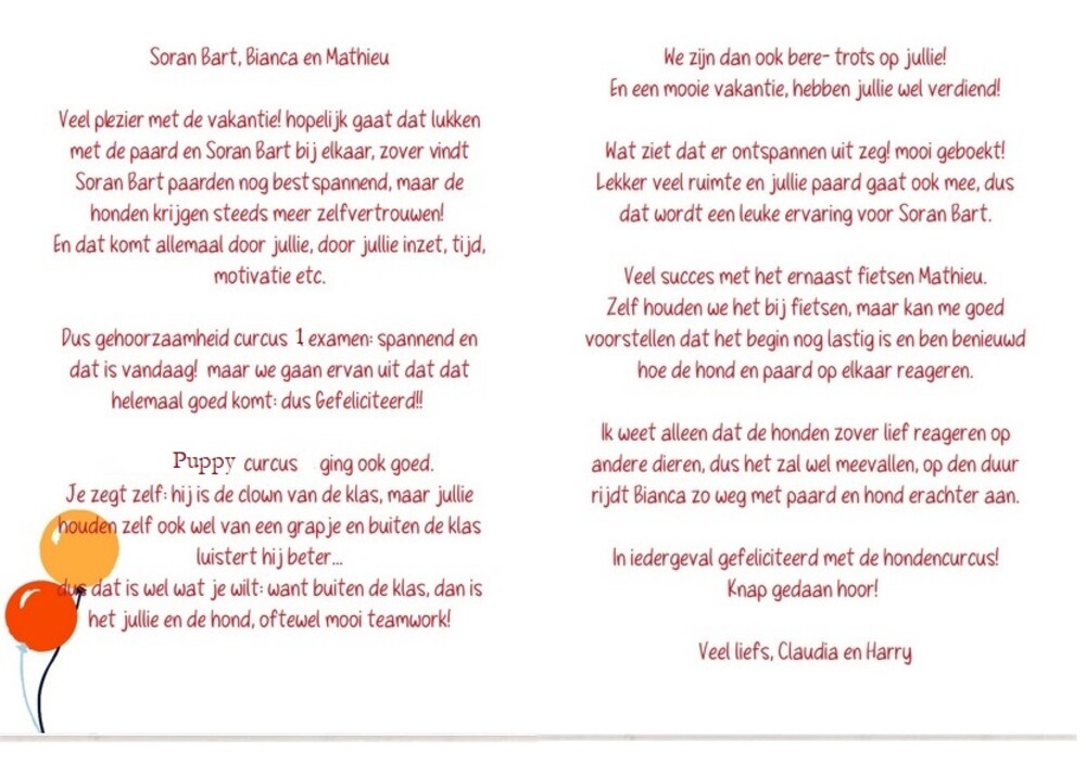 29 juni: Soran Bart doet het super goed! Past zich super goed aan! Hij rent als de beste, mijn ouders schrokken zich rot van hem. (op vakantie)