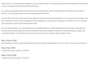 De vier lessen bestaan uit 1 theorieavond en 3 praktijkavonden en worden gegeven door Tom Rosens. Tom werkt inmiddels 10 jaar als kynologisch instructeur met zowel puppy’s, pubers als volwassen honden. In zijn lessen staat positieve training op een creatieve manier altijd voorop.