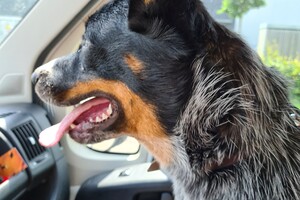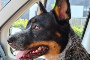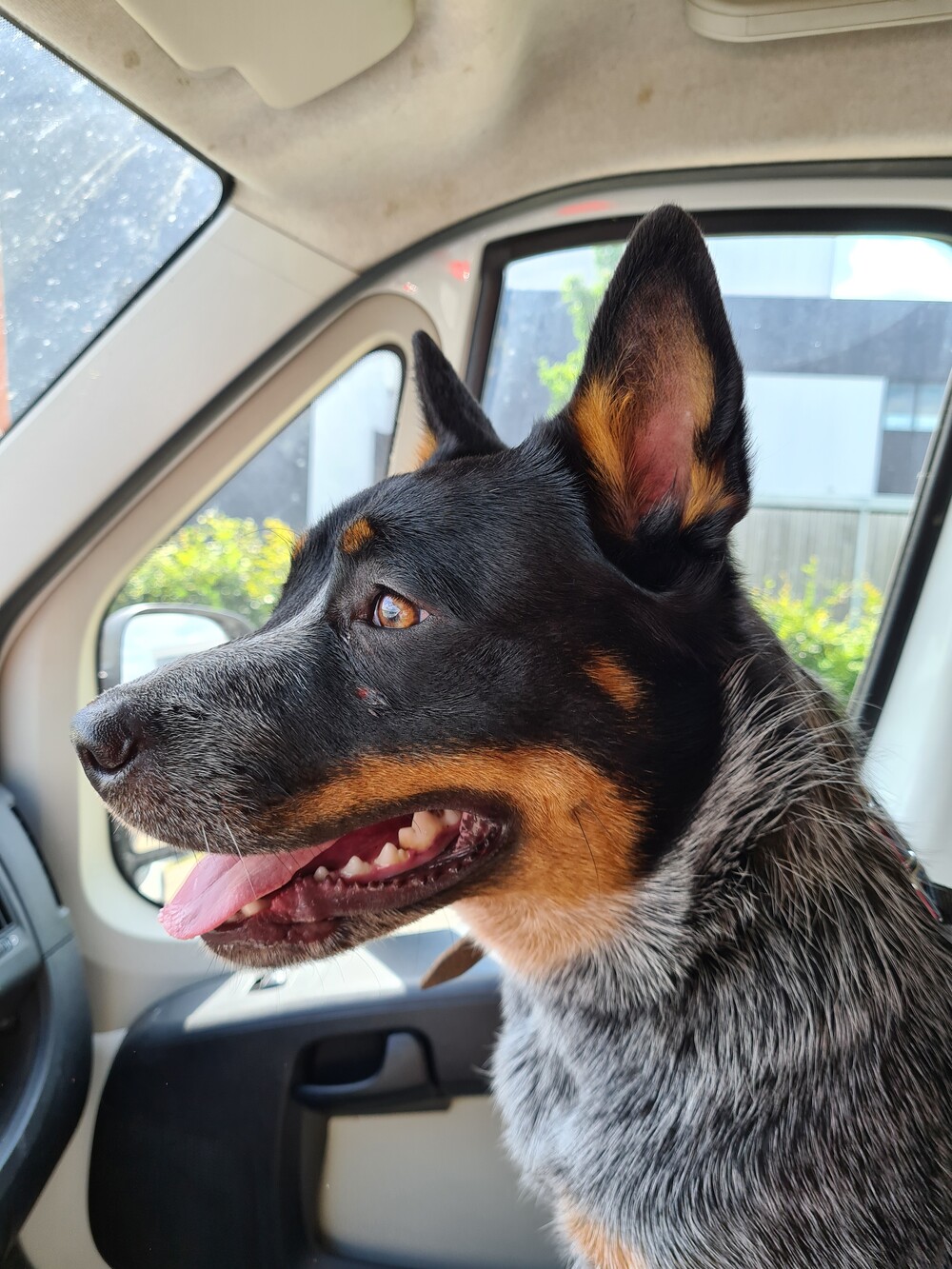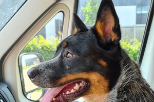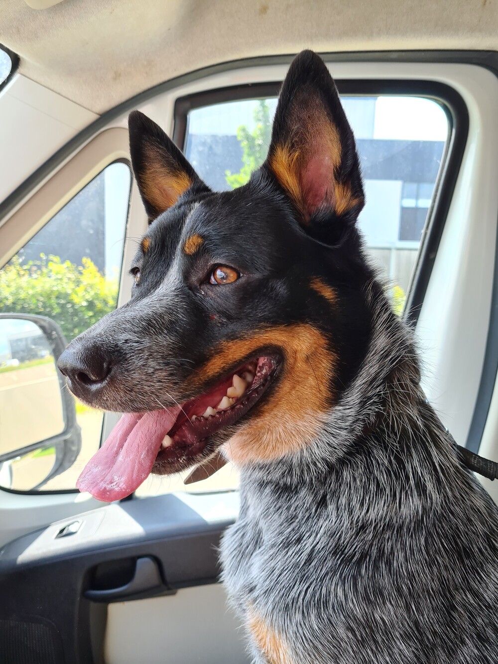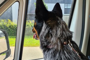 Meerijden in auto, spannend dat ze dat vindt. Ik ga dadelijk wandelen met haar. Harry moest ergens opdracht maken, we gaan mee: auto rit en dan in de buurt van harry's opdracht wandelen.