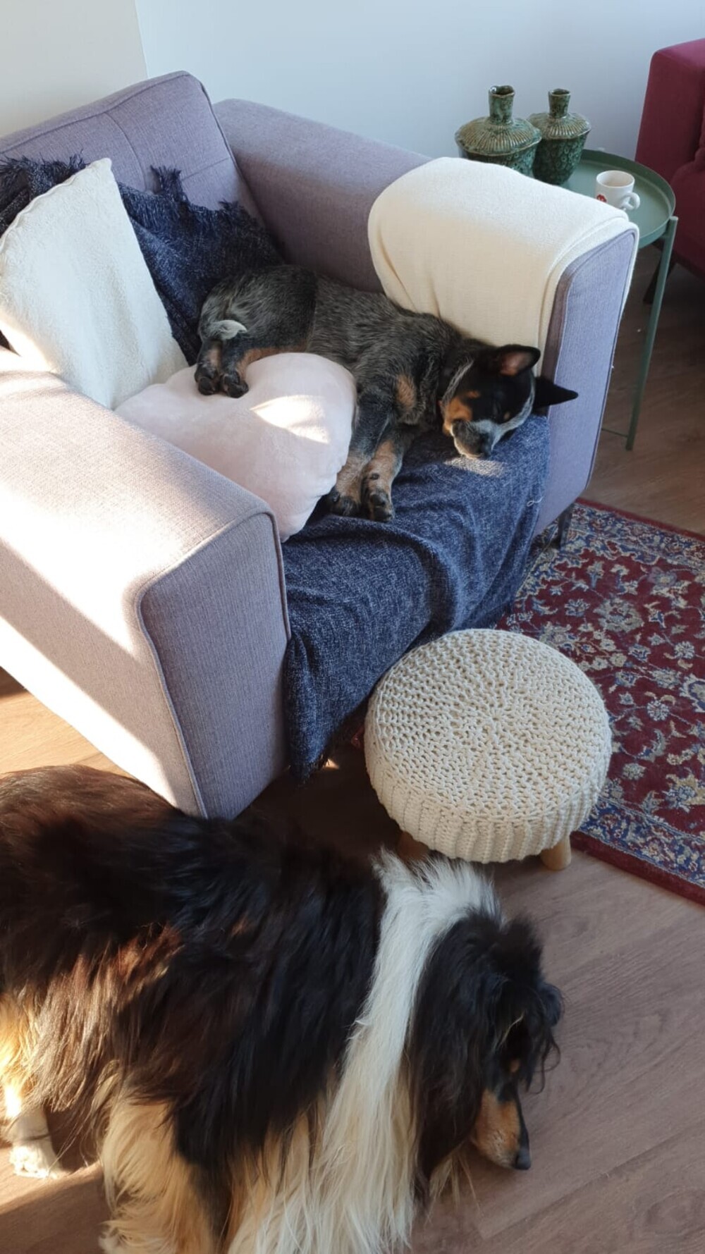 Hij loopt los en komt als je hem roept, soms met beloning, aan de riem gaat ook prima, af en toe naar Glenn rennen, maar geen rare acties. Hij is heel stabiel, herstelt zich snel bij vreemde acties en geluiden en is gek met mensen.