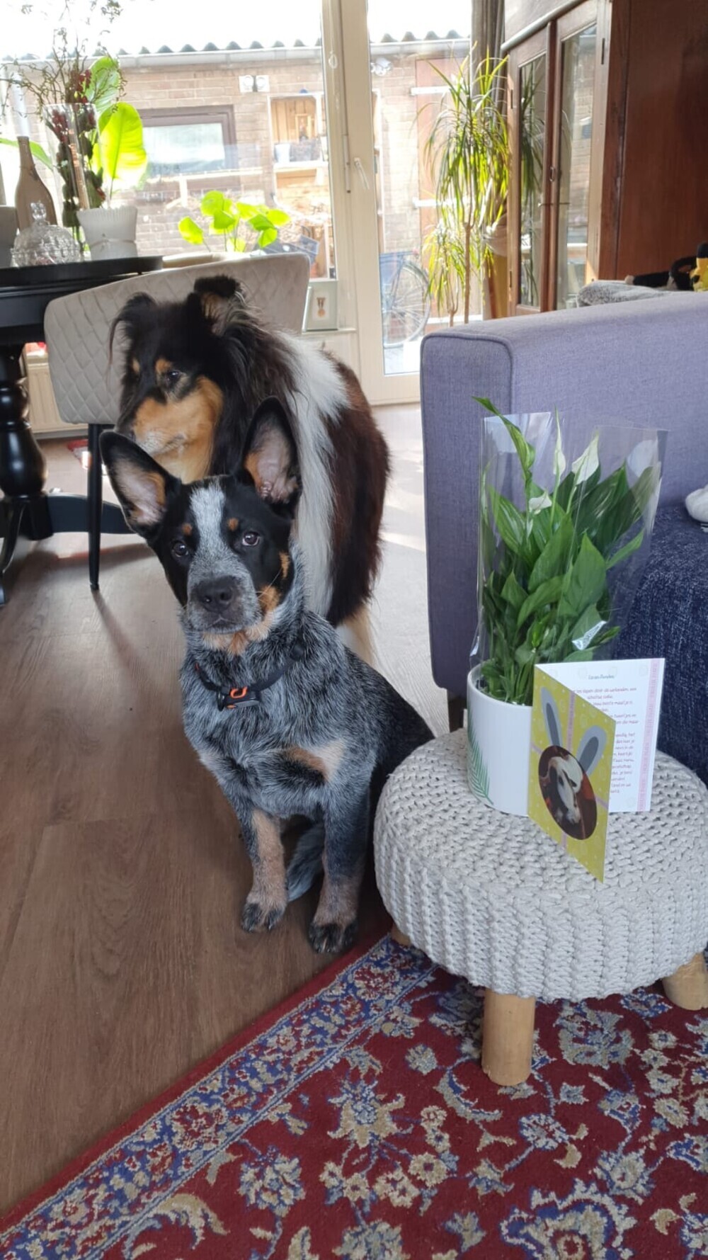 28 januari: hij leert heel snel, is al zindelijk, gaat al zitten bij een beloning, wacht als onze andere hond ook moet wachten, is verschrikkelijk energiek en heeeeeeel erg nieuwsgierig en ondeugend.