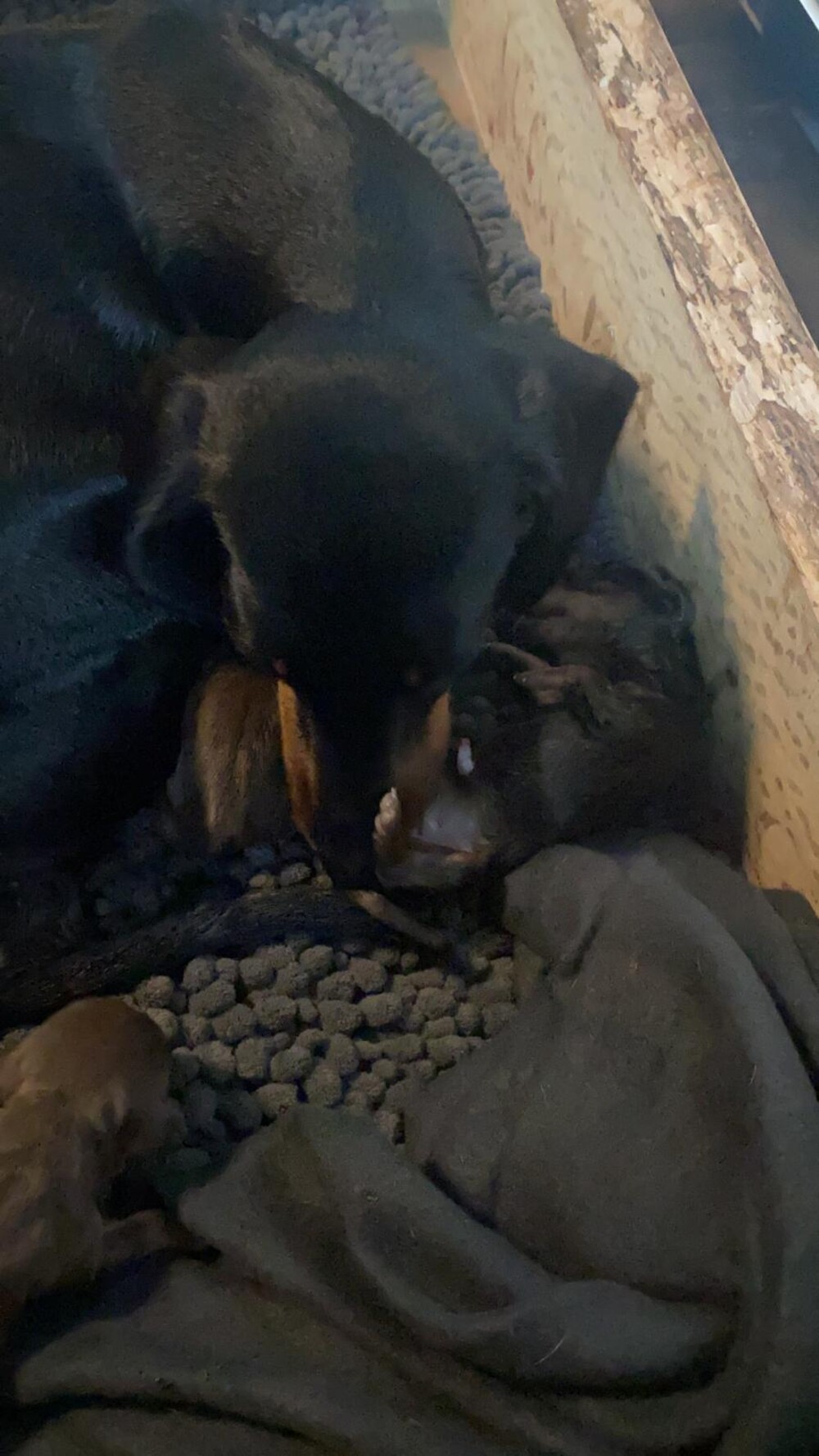 Jullie willen het niet geloven: voor de operatie kamer kreeg Cato enorme persdrag, met behulp van de dierenarts is de laatste geboren: een zwart reutje! - een hele rare lange dag: hij moet nog even gaan drinken maar dat komt vast goed. - Hij is net zo zwaar als de eerst geboren teefje -