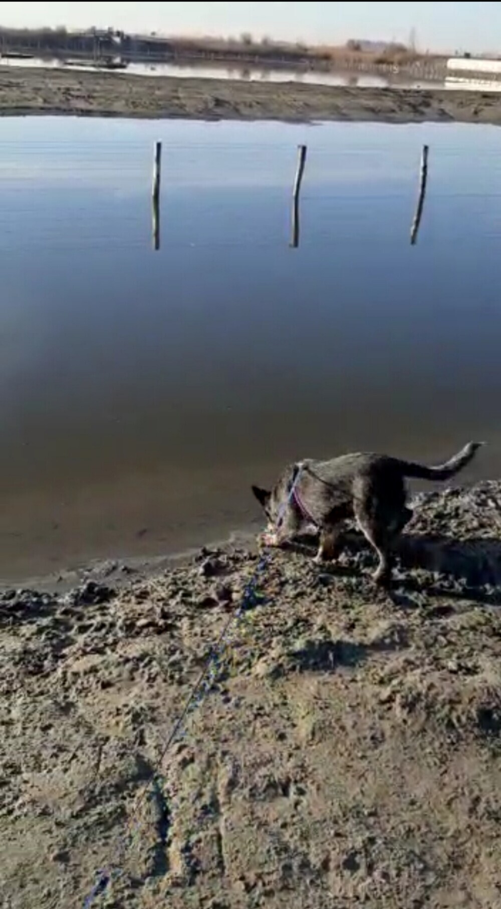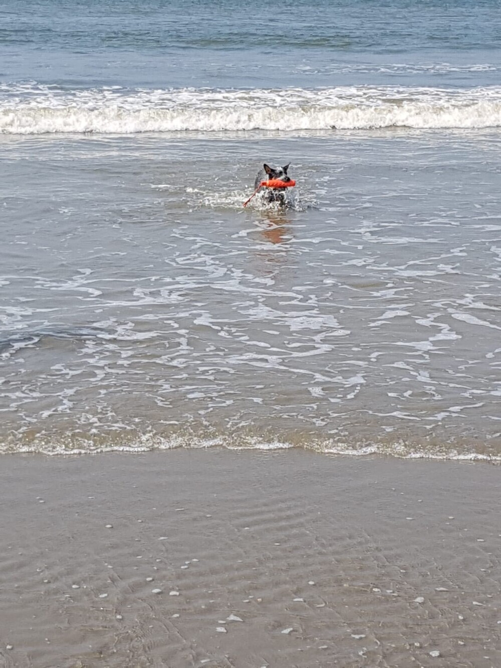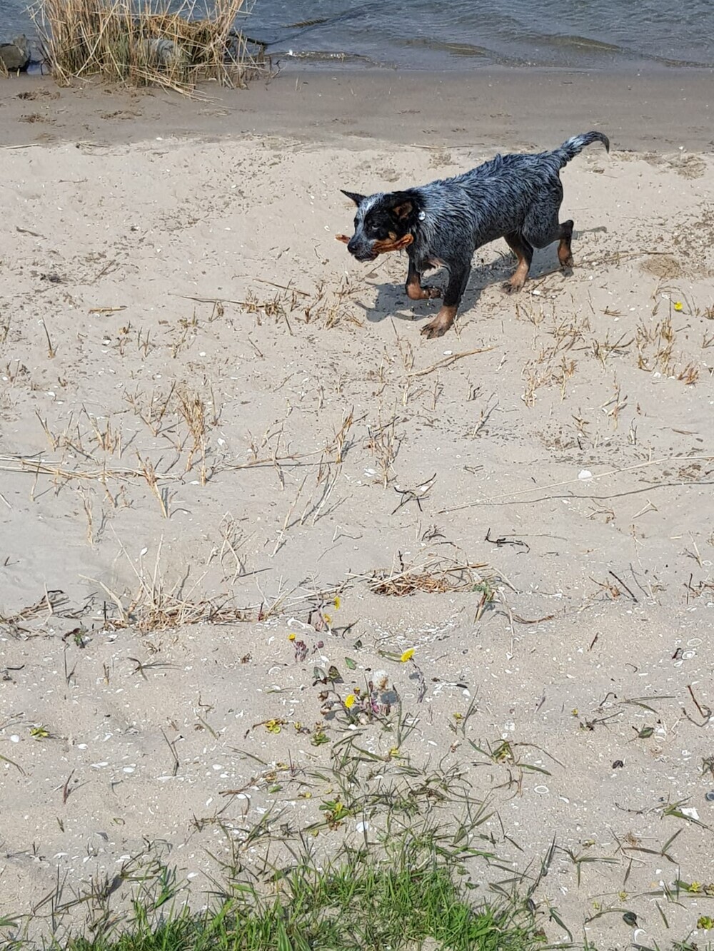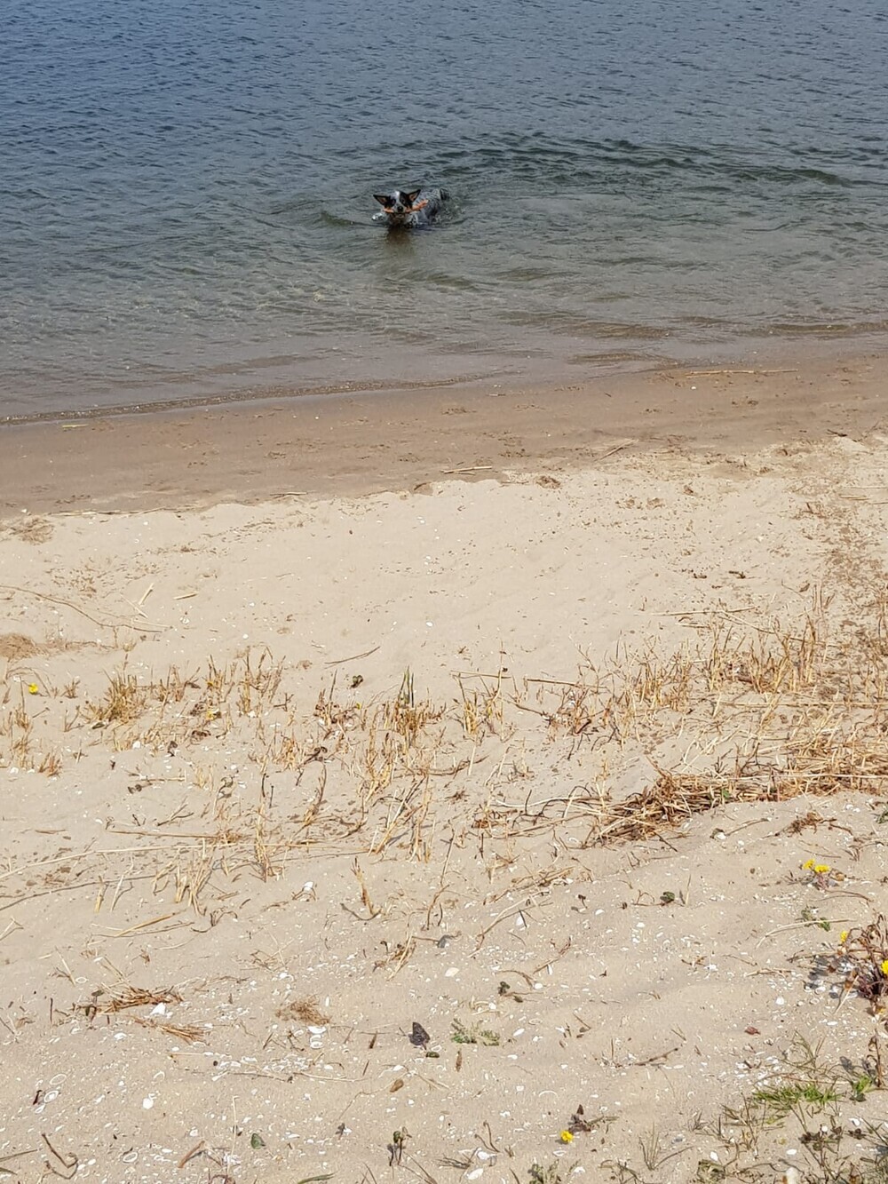 Ze zwemt nog niet echt, waar ze kan lopen vindt ze prima. van mij hoeft dat ook nog niet, water is best koud. Ze gaat tot ongeveer buik diepte. Takken en riet uit het Foxholstermeer aan het halen. Is ze mooi druk mee. Voordeel is dat ze straks mooi moe is en ze laat de koeien met rust die hier lopen. Ze blijft wel keurig bij mij in de buurt: Das ook fijn!