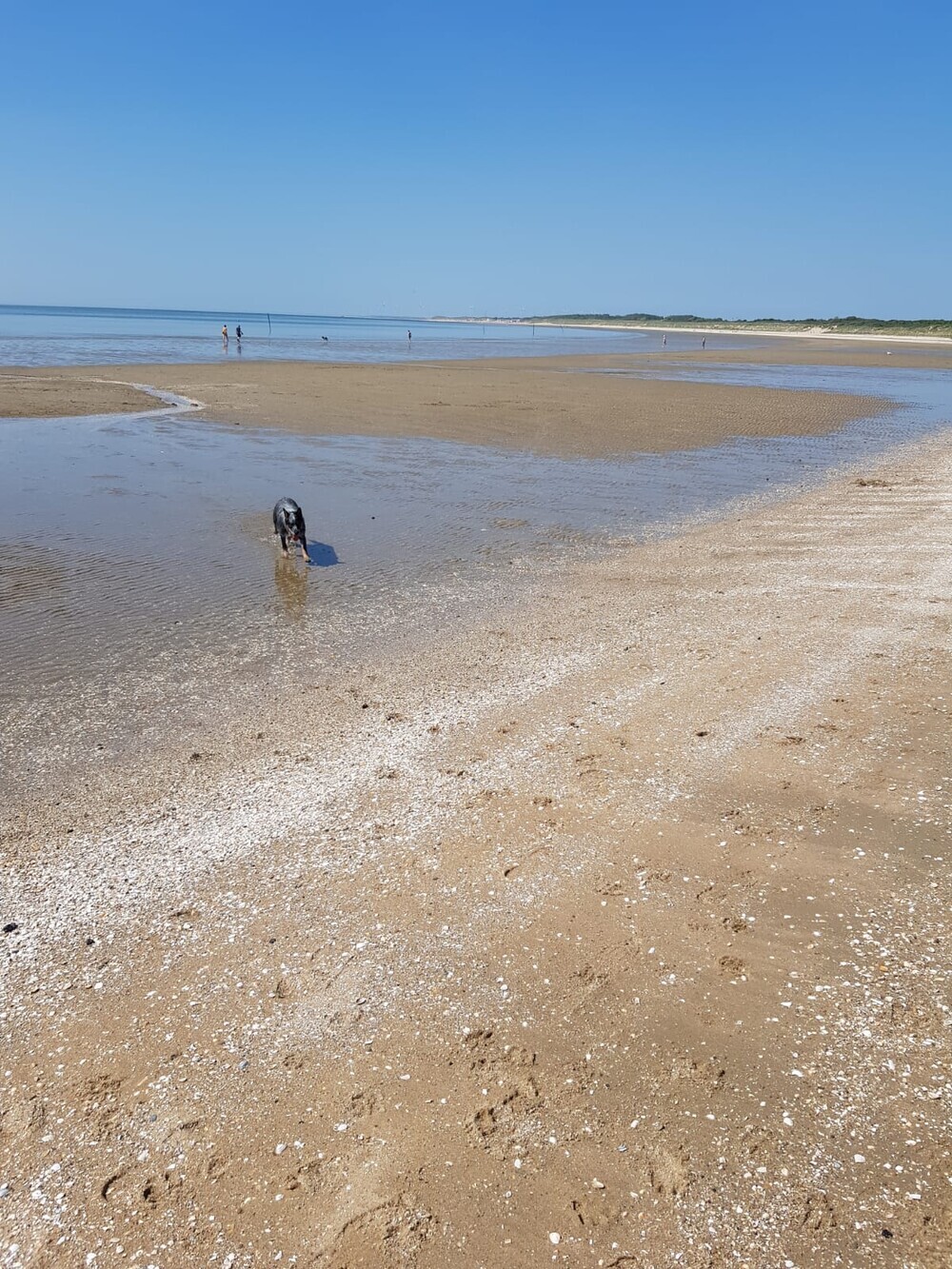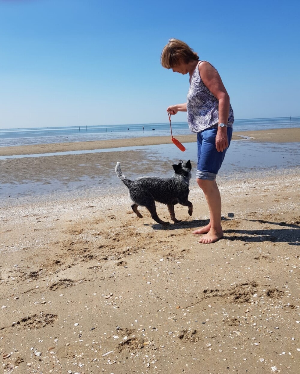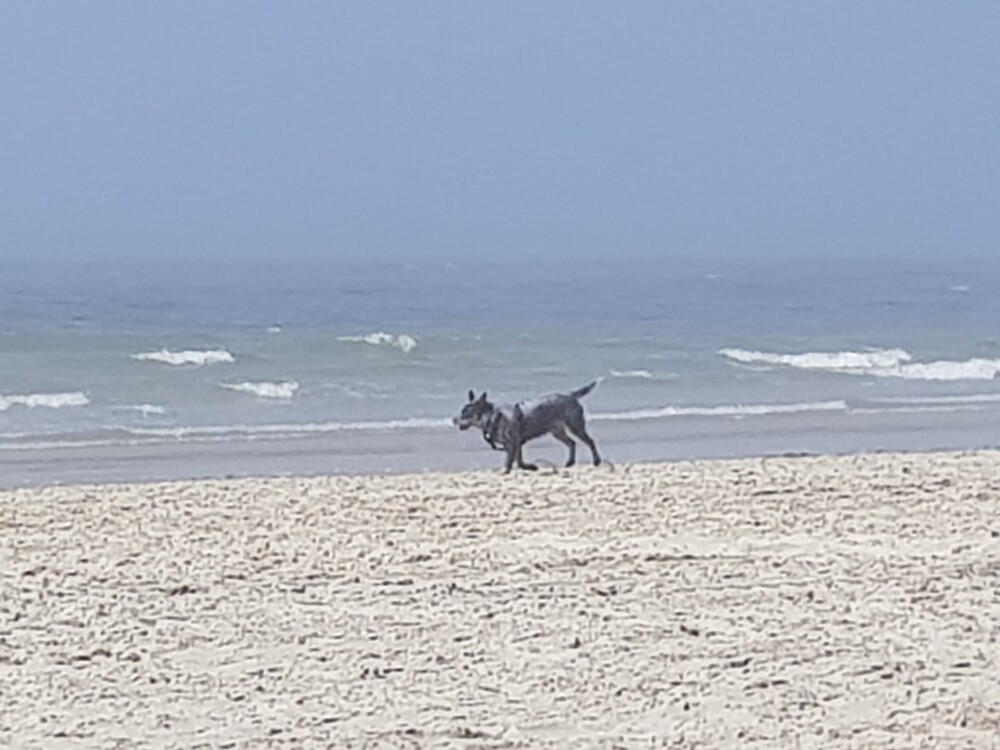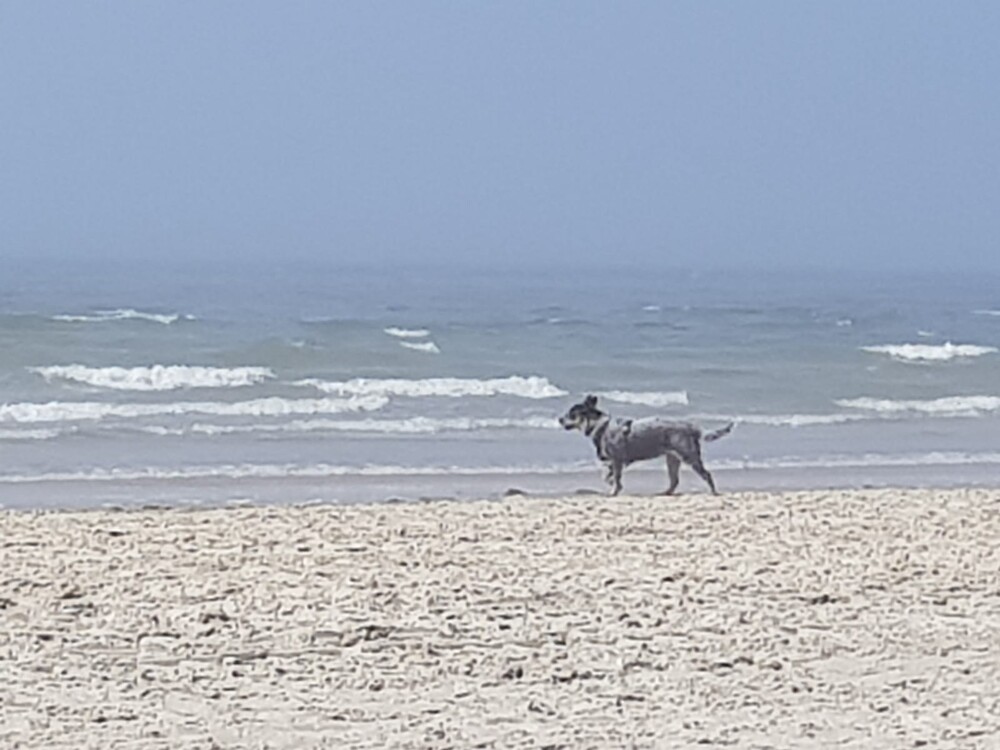 Vanmiddag ging het prima en wordt elke dag leuker. Ik heb vanmiddag fluit geprobeerd, op het strand, dus nog nooit eerder fluit geprobeerd: Ava Kira, staat aan zee, ik zeker 50 meter verder en ik fluit, Ava Kira komt op me af, vlak voor mijn neus zit en lie down, PERFECT!