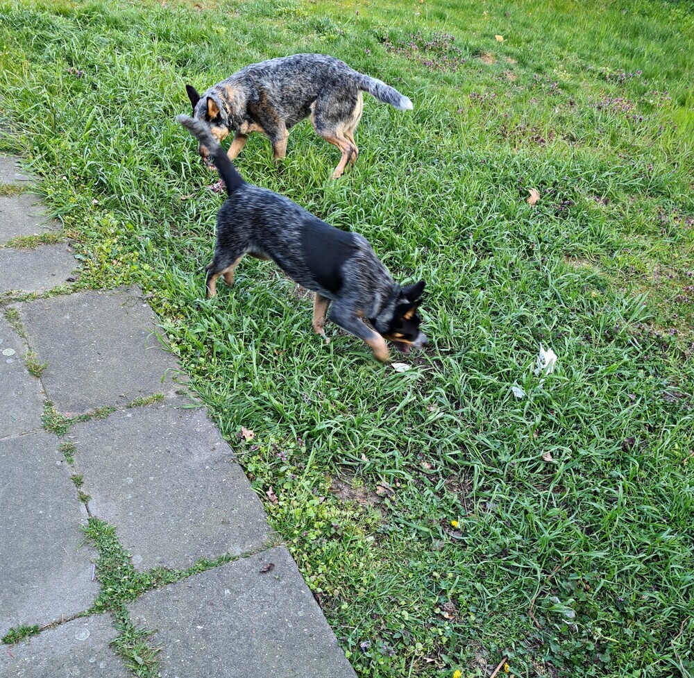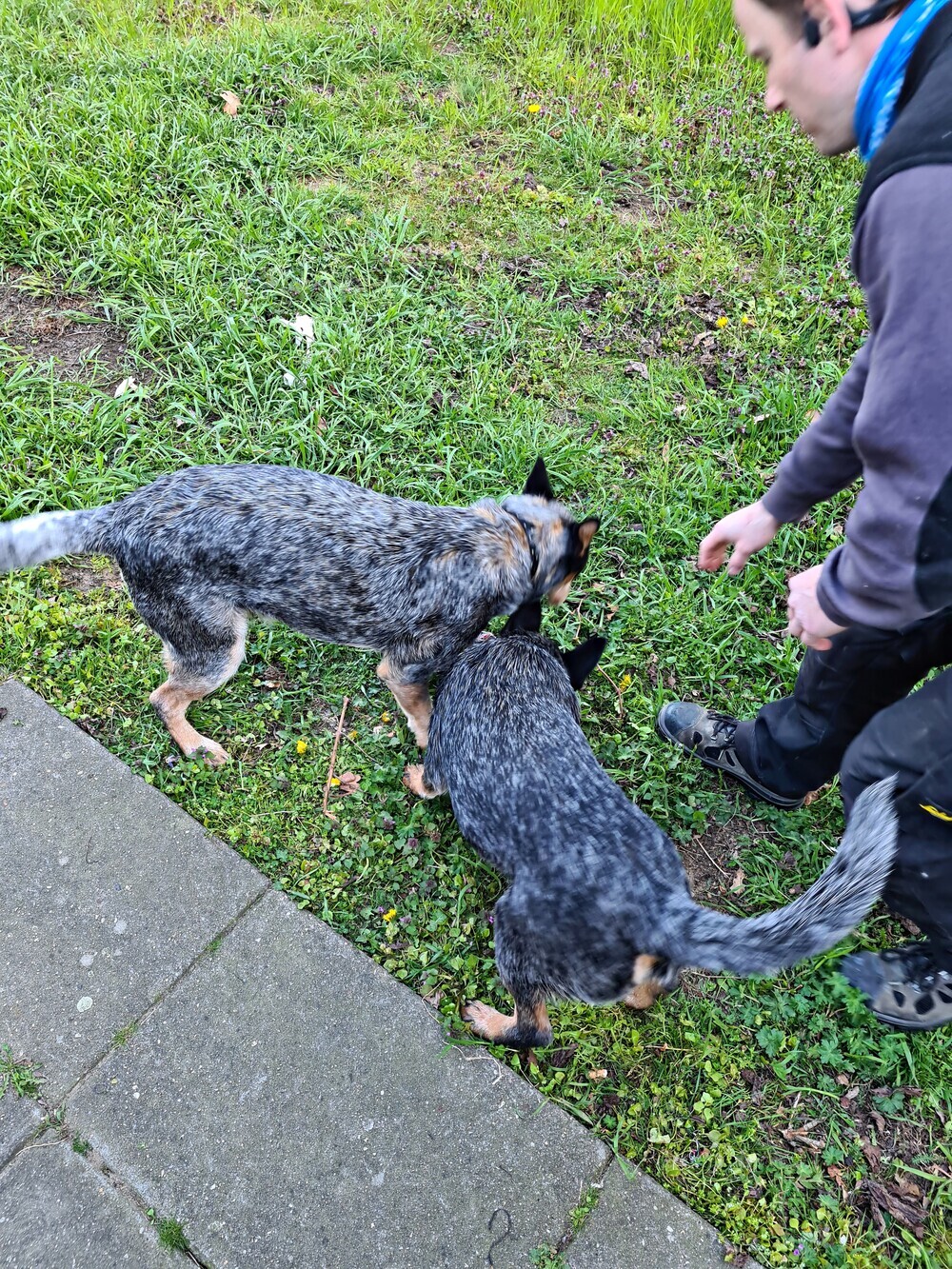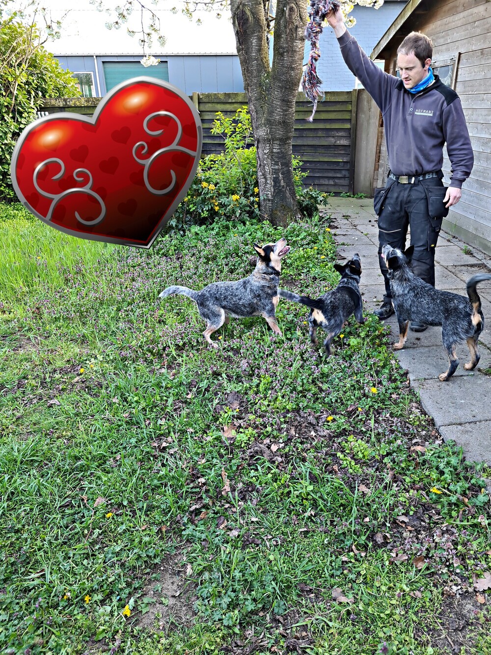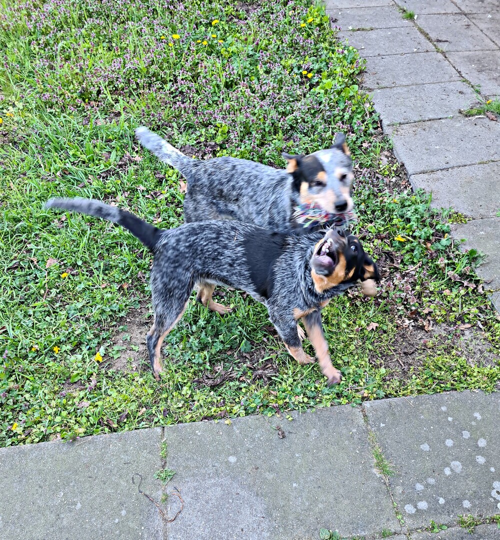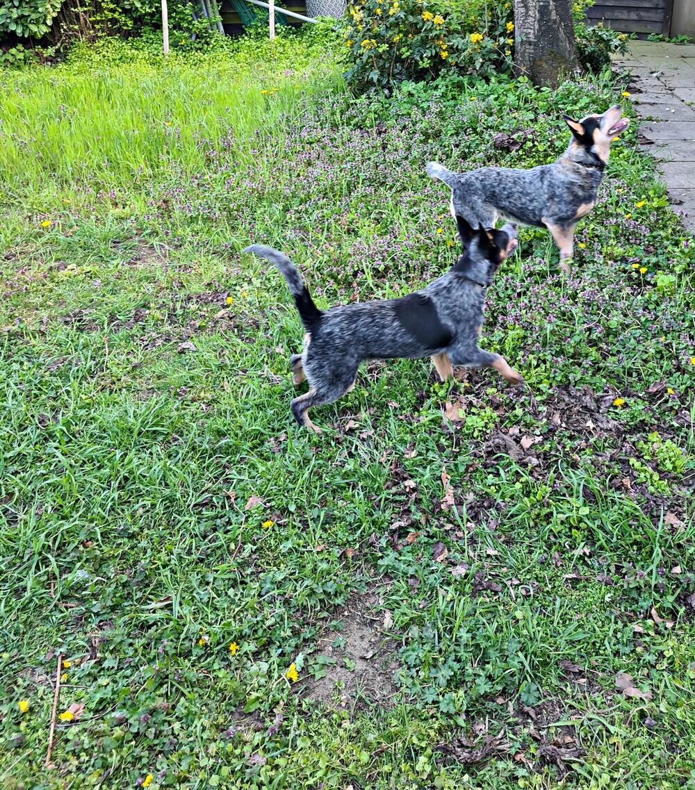 18 april: mooie zomerse dag, we wandelen regelmatig een op een met de puppy's. Harry zei vandaag tegen me: Vida wandelt mooi mee en Yada wandelt alle kanten op.
