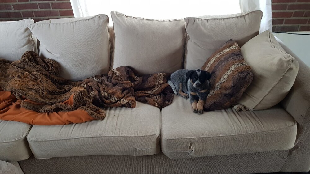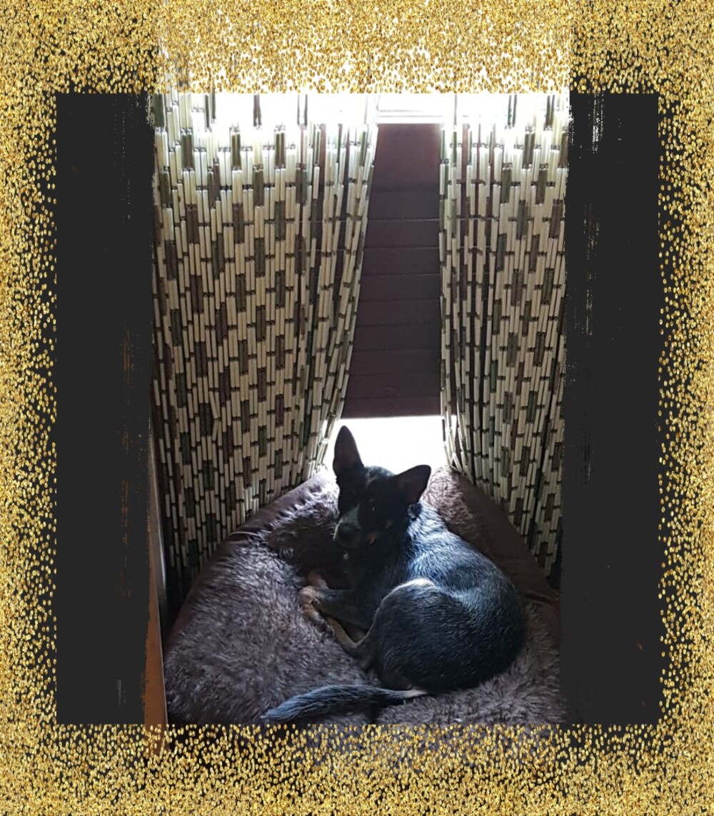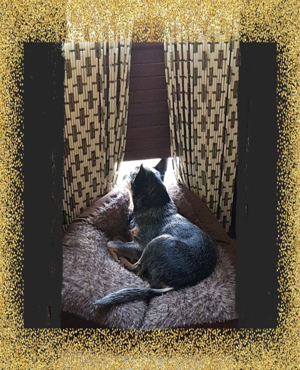 7 mei: de hond heeft zelf haar kussen versleept om naar buiten te kijken