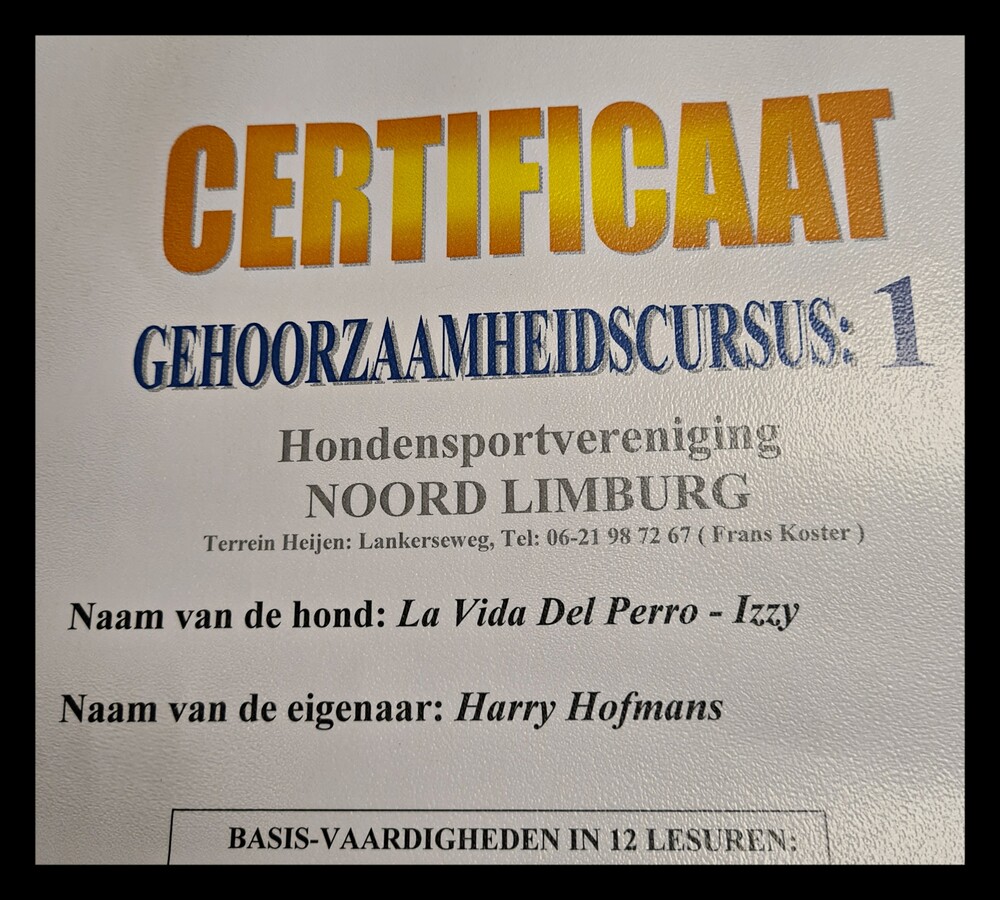 11 december: met Izzy examen gedaan voor Beginners curcus, we zijn geslaagd! We kregen van een andere curcist ook een mooi compliment dat we een mooie muilkorf voor de hond(en) hebben en vroeg dan ook waar we die gekocht hebben, omdat die cursist ook onze muilkorf wil aanschaffen.