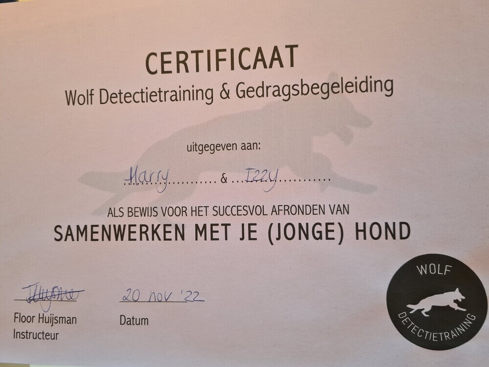 20 november 2022 certificaat gehaald: cursus samenwerken met je (jonge) hond