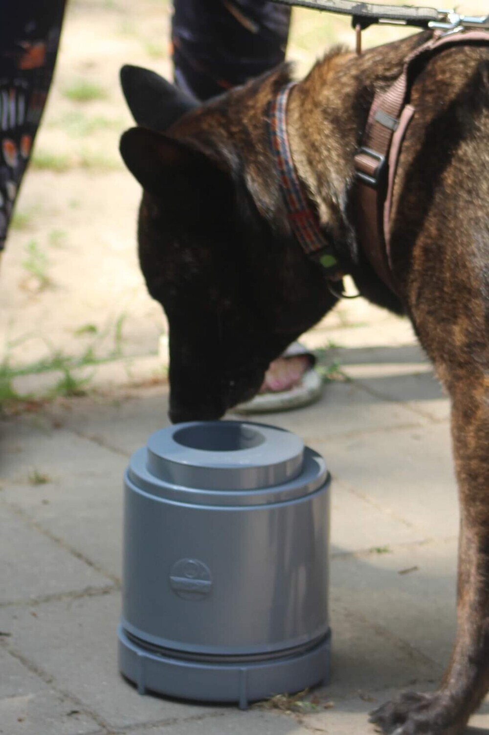 Ondanks het gras, brandnetels en het gestampte gras, zoekt ze op de container haar geur