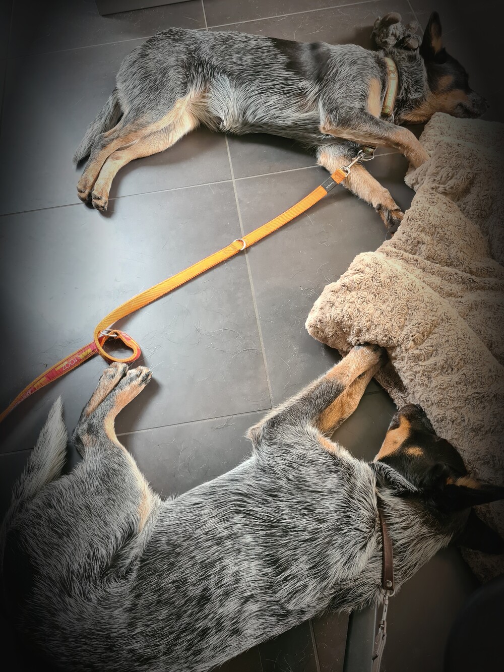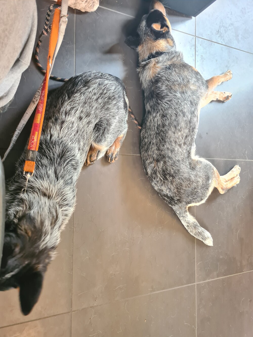 Ik heb Bucky en Izzy weer thuis. Izzy was erg aanhankelijk. Bucky was aan het spelen met andere pups en Izzy zat steeds te blaffen. Izzy hield op met blaffen toen ze bij Bucky samen was. Toen was het goed. Ze hebben wel apart van elkaar geslapen. Even rust komen op eigen plek.