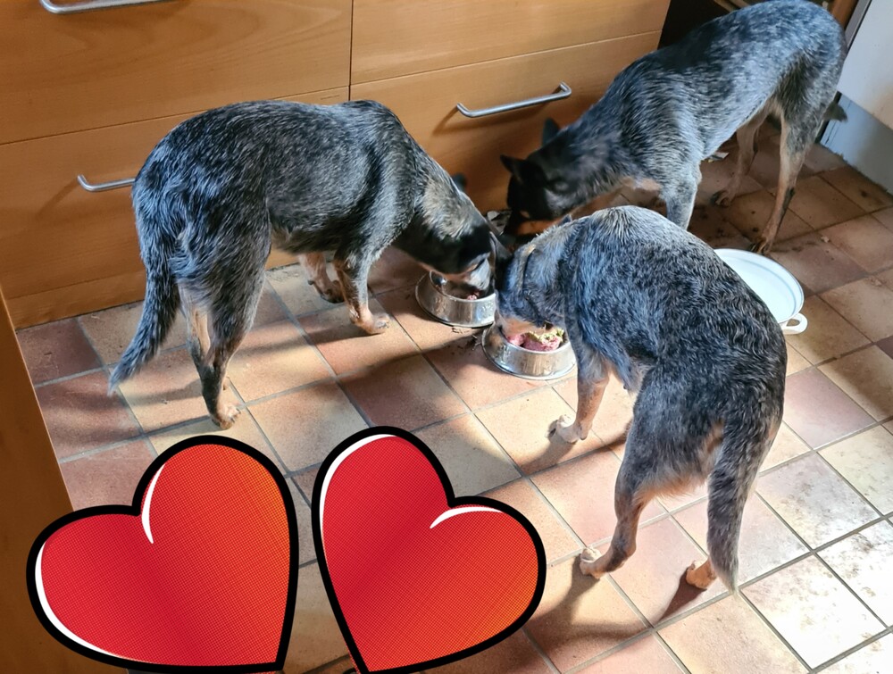 Bij mijn ouders krijgen de honden ook altijd wat lekkers, als ze niet alles opeten dan neem ik dat mee: ik leg dat dan in de bench, dus wie mee gaat met de auto en in de bench gaat: die heeft dan geluk, want daar ligt dan nog wat lekkers in.