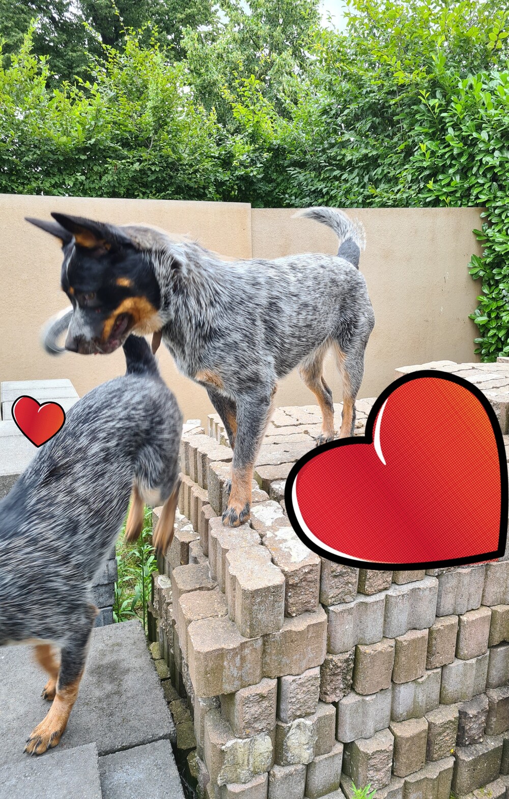 3 juli: Ik denk wel dat Dakota haar pup herkend, zover wordt ze nog niet gecorrigeerd door haar, maar ze wordt ook niet "afgewezen" en vandaag heb ik samen met Dakota en Izzy tegelijk gewandeld: dat ging goed, zonder enige uitlatingen naar elkaar toe, dus geen frustratie of wat dan ook, gewoon relaxed gewandeld.