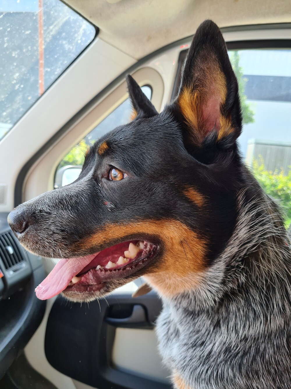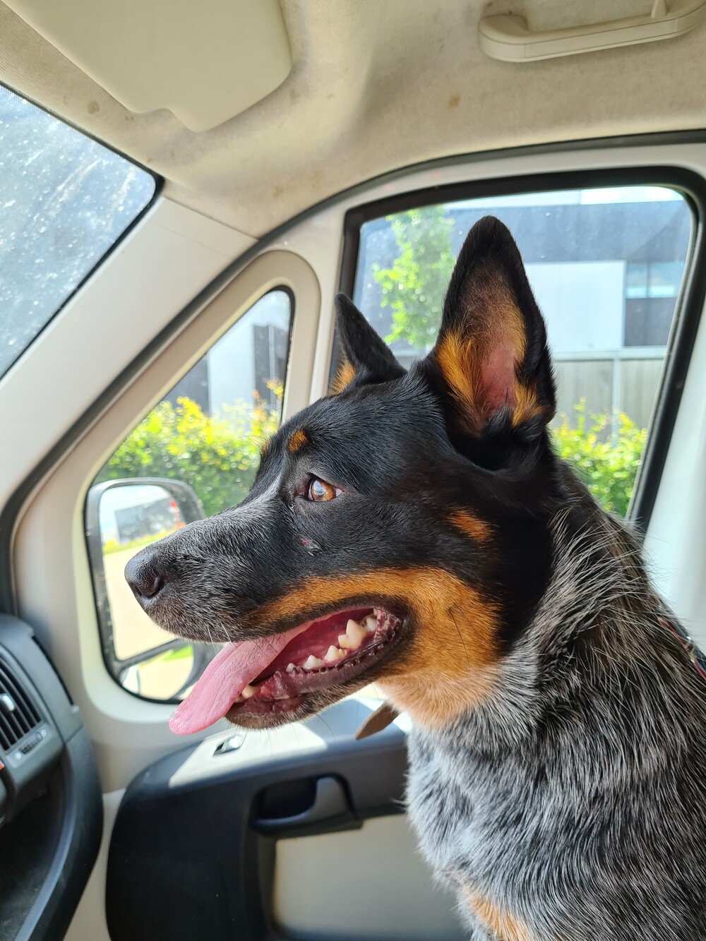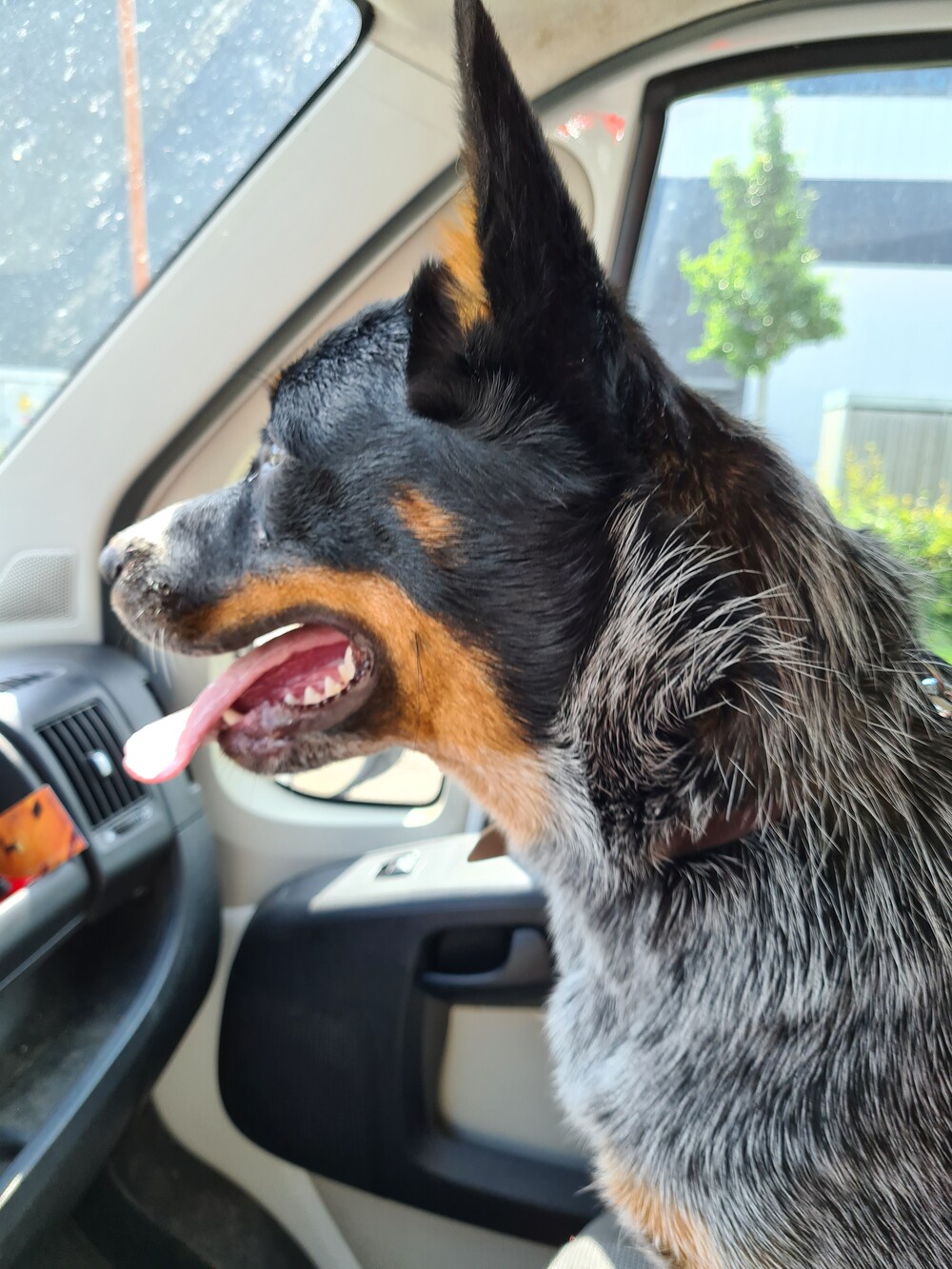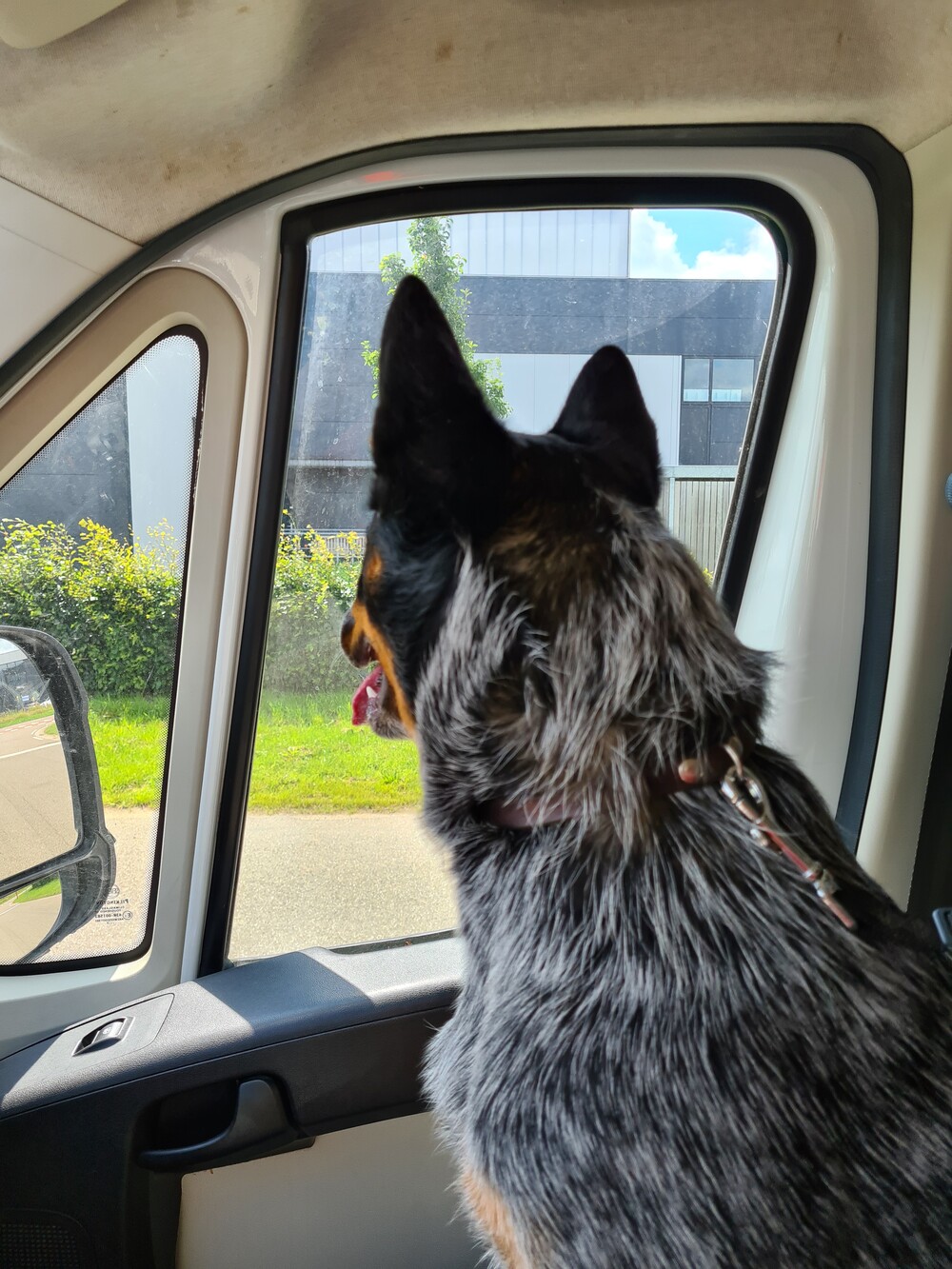 Meerijden in auto, spannend dat ze dat vindt. Ik ga dadelijk wandelen met haar. Harry moest ergens opdracht maken, we gaan mee: auto rit en dan in de buurt van harry's opdracht wandelen.