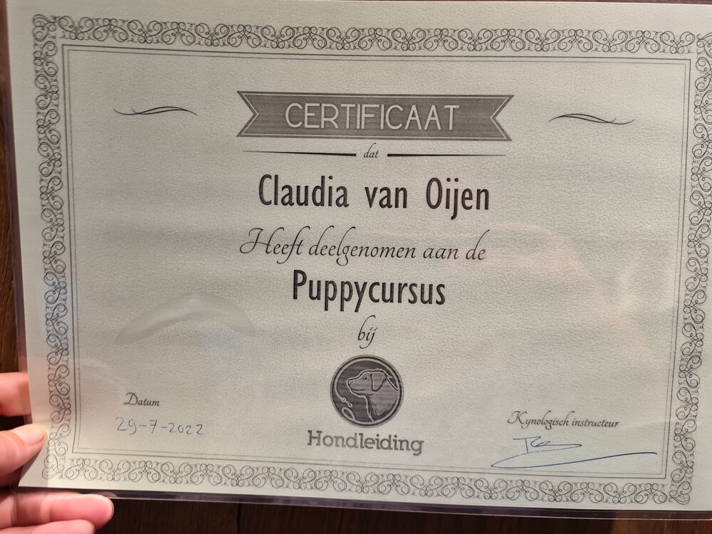 29 juli: certificaat gekregen voor puppy curcus met Claudia