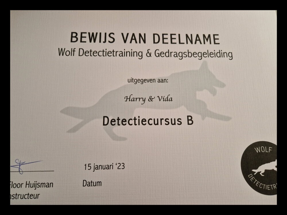 8 november: we merken toch wel aan Vida dat ze op honden goed gesocialiseerd is, maar met mensen kan dit beter, we zijn nu bezig met “sociale wandelingen/oefeningen” om dit toe te passen op mensen naast gehoorzaamheidslessen en detectie bij deze hondenschool